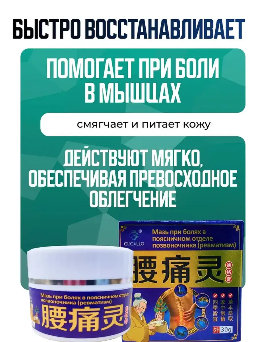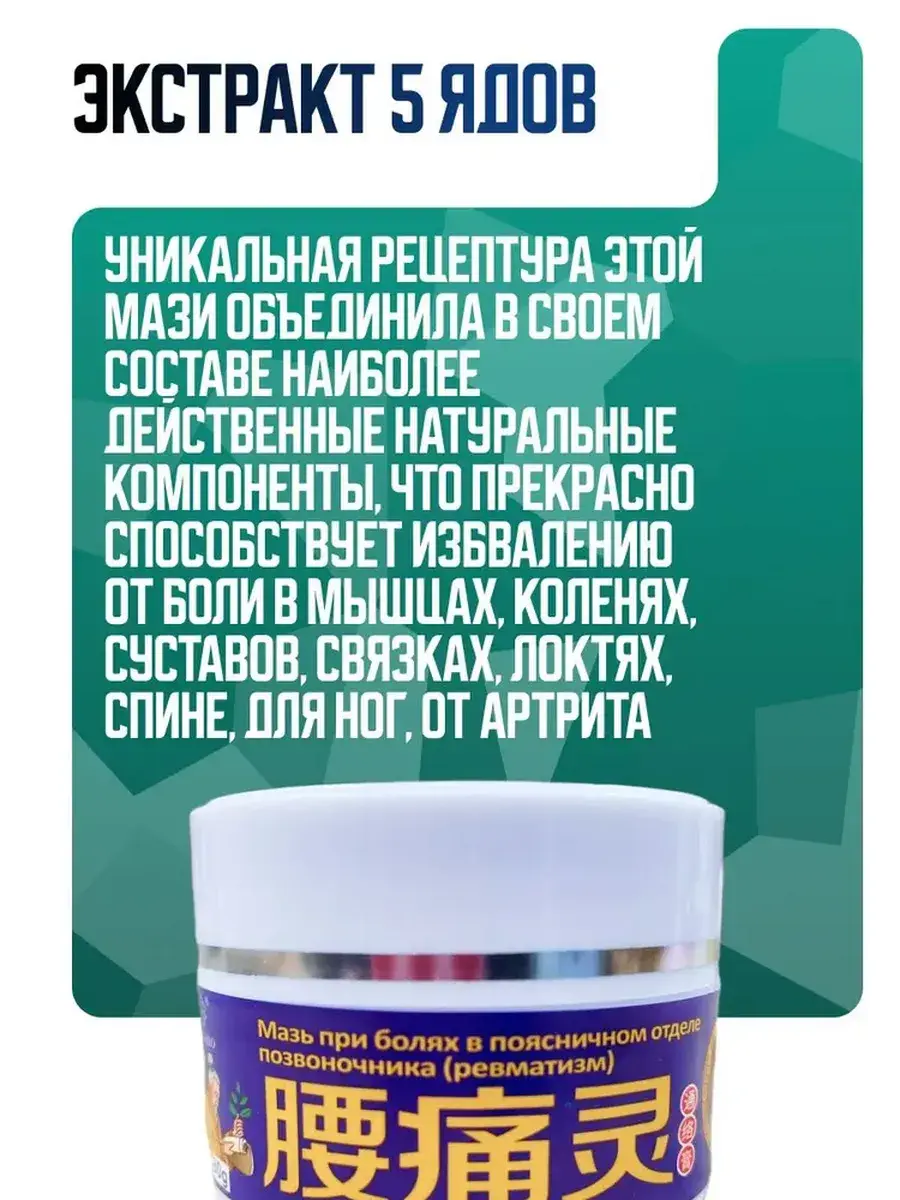 Мазь для облегчения боли в поясничном отделе позвоночника и при ревматизме. Это эффективное дополнительное средство к основному лечению, обладающее противовоспалительными и обезболивающими свойствами. Специально подобранные ингредиенты китайской медицины помогают уменьшить боль в мышцах и суставах, а также при ревматизме. В составе мази есть активный ингредиент Sanguis Draxonis (смола «Кровь дракона»), которая используется для профилактики остеопороза и заживления переломов костей. Мазь уменьшает боль и воспаление в поясничном отделе позвоночника (при ревматизме и радикулите). Перед использованием рекомендуется провести тест на небольшом участке кожи на индивидуальную непереносимость компонентов. Не наносите мазь на открытые раны и проблемные участки кожи. Беременные женщины и дети до 16 лет должны использовать мазь с осторожностью.
