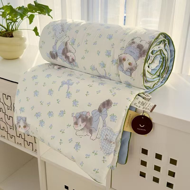 • Очаровательный Дизайн с Котятами: Одеяло украшено милым принтом с изображением котят в чепчиках и бантиках. Пастельные тона и акварельный стиль рисунка создают атмосферу нежности и безмятежности. Мелкие голубые цветочки добавляют дизайну легкости и воздушности.