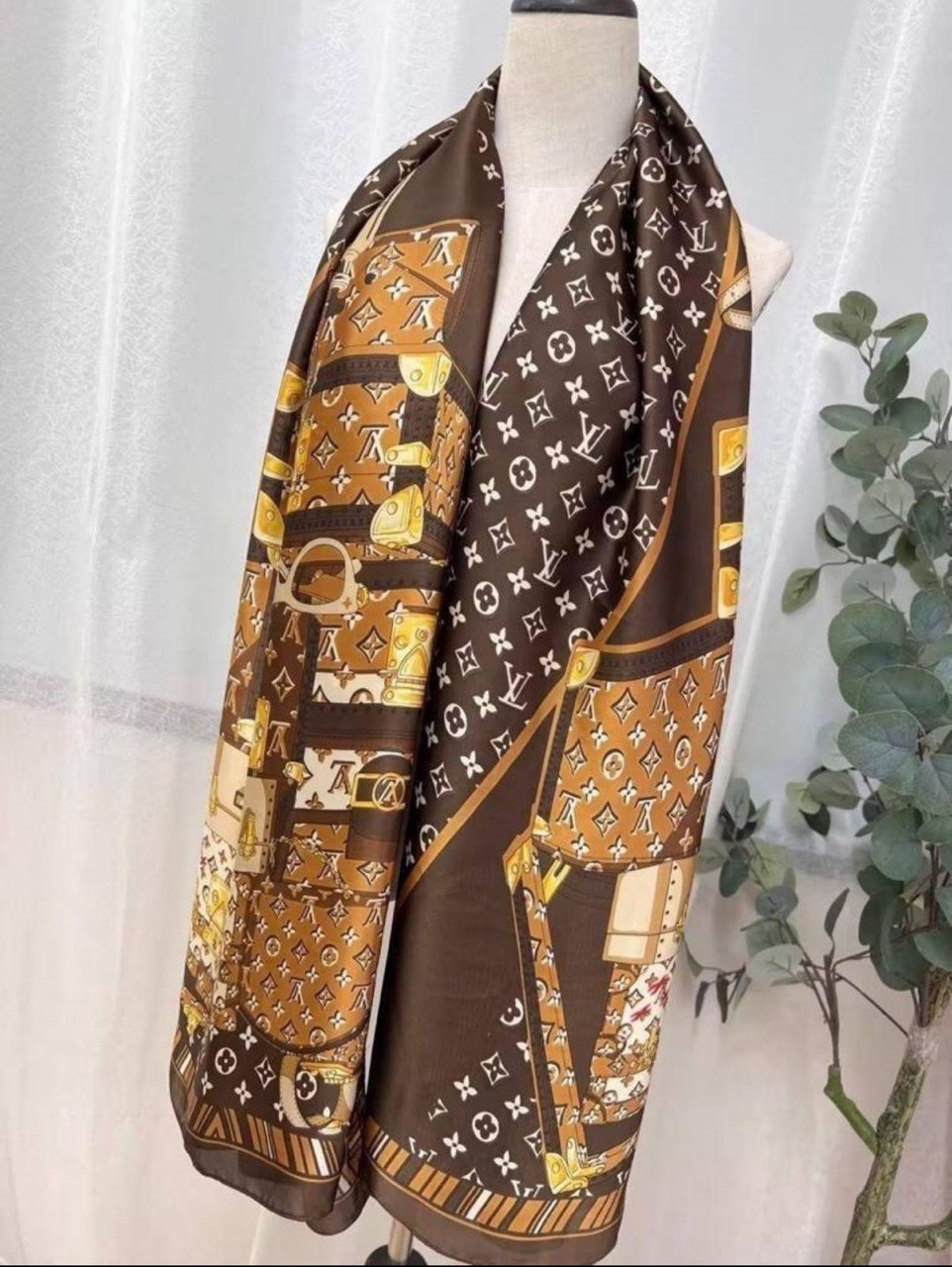 Шелковый палантин от Louis Vuitton — это не просто модный аксессуар, а настоящее произведение искусства, призванное подчеркнуть статус и утонченный вкус своей обладательницы. Изделие выполнено из высококачественного натурального шелка, обладающего непревзойденной гладкостью, деликатным блеском и приятной текстурой, которая ласково прикасается к коже. Материал легко драпируется, образуя изящные складки, что позволяет носить платок множеством различных способов, каждый раз создавая новый, неповторимый образ.