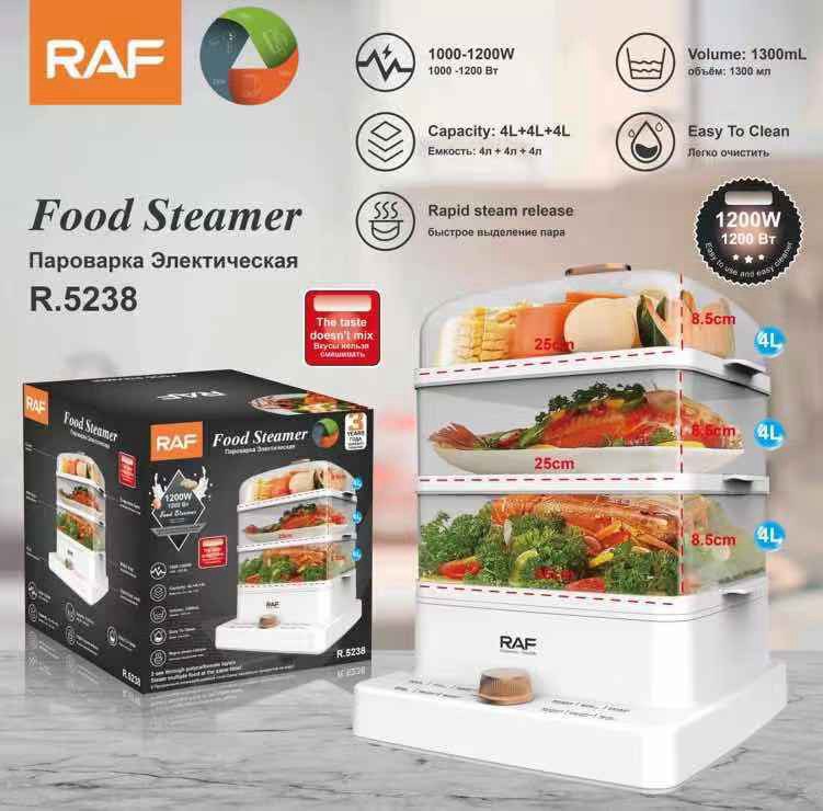 Электрическая пароварка RAF R.5238 — трёхъярусная модель для приготовления блюд на пару. Объём каждого яруса — 4 л, общий объём резервуара для воды — 1300 мл. Мощность устройства — 1000–1200 Вт. Высота каждого яруса — 8,5 см, диаметр — 25 см. Оснащена функцией быстрого выделения пара, отличается простотой в очистке. Подходит для одновременного приготовления нескольких блюд.