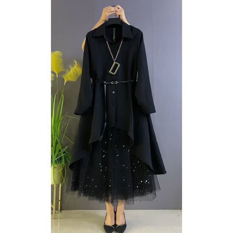 Элегантное чёрное платье-рубашка с асимметричным низом и длинными рукавами. Верх выполнен из плотной ткани, дополнен поясом на талии, который подчёркивает фигуру. Нижняя часть — из чёрного фатина с мерцающими блёстками, создающими эффект звёздного неба. Воротник классический, застёжка на пуговицы. Образ завершает стильное колье-цепочка с геометрической подвеской.
