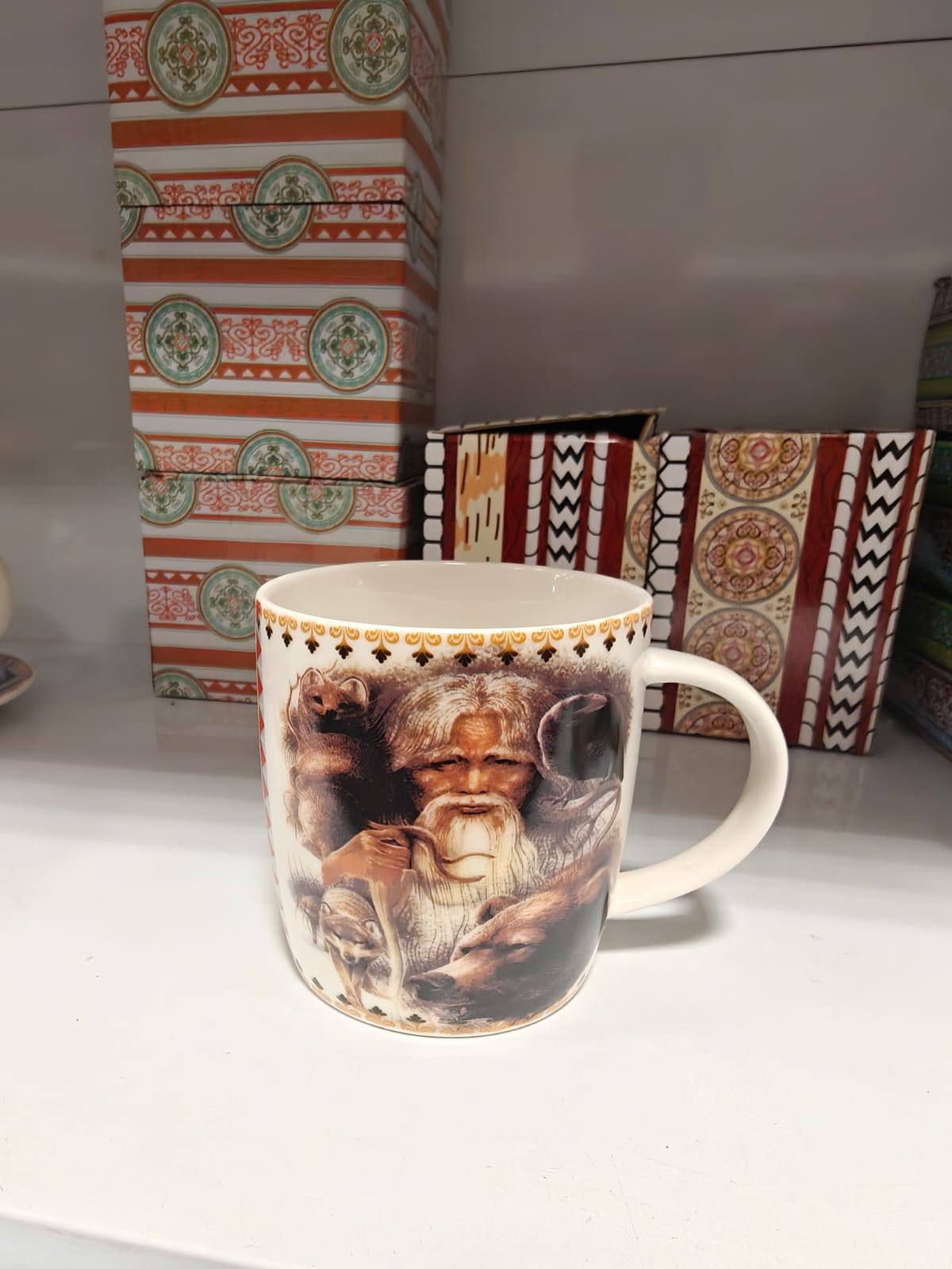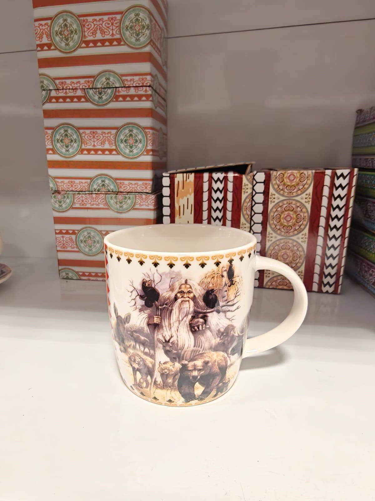 Эта эксклюзивная сувенирная кружка — не просто посуда, а настоящее произведение этно-искусства. Центральное место в дизайне занимает величественный образ якутского старца, олицетворяющего мудрость предков и неразрывную связь человека с природой. В окружении тотемных животных — волка, медведя и совы — он передает энергию бескрайней тайги и самобытность Республики Саха.