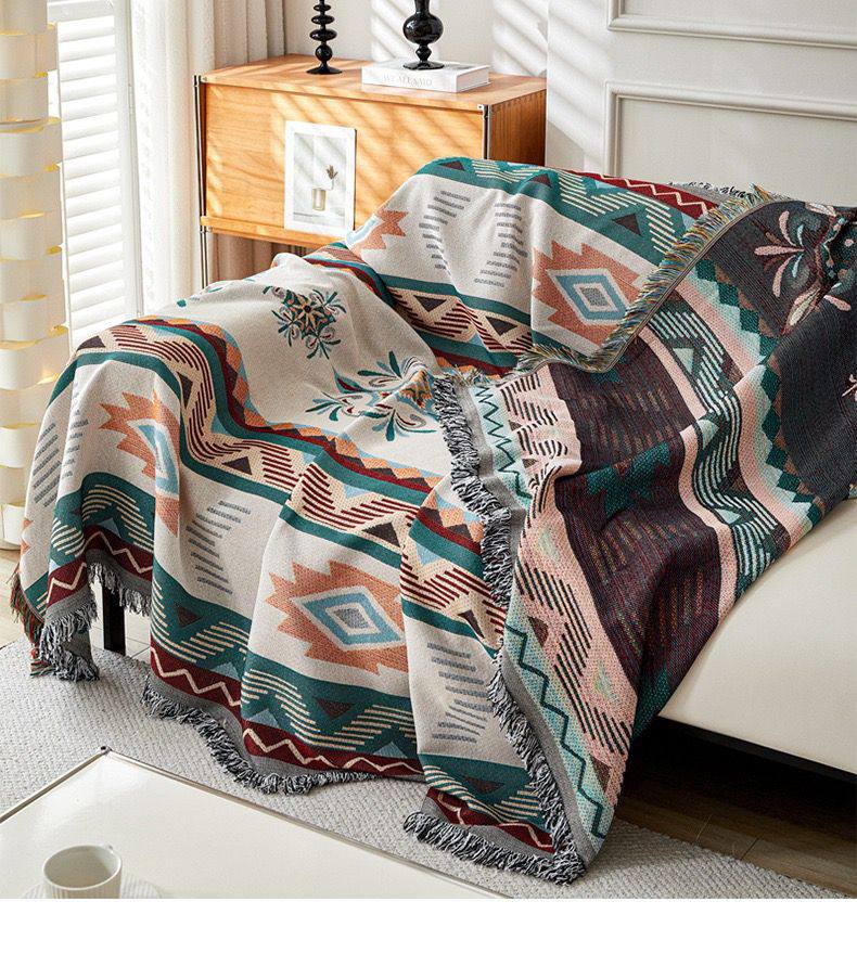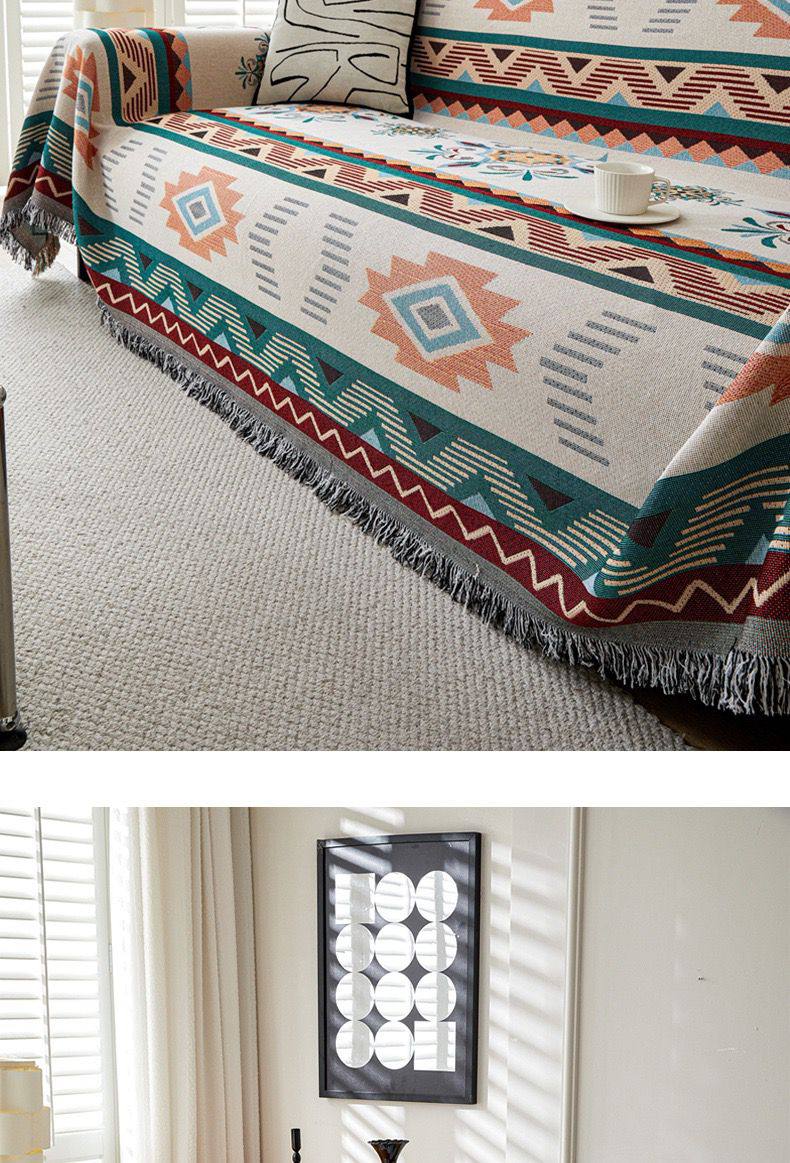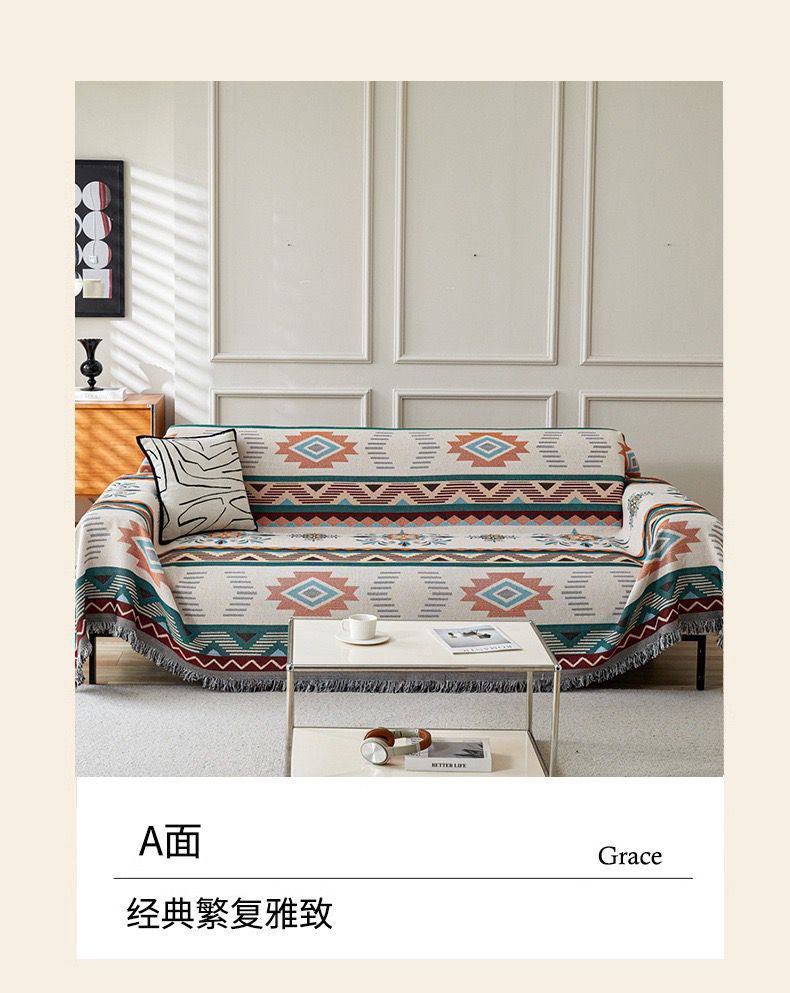 Изысканное двустороннее покрывало в этническом стиле — идеальный инструмент для мгновенного обновления интерьера. Сторона «А» (модель Grace) выполнена в благородных светлых тонах с детальным геометрическим орнаментом, который выглядит классически и утонченно. Плотное жаккардовое плетение из хлопковых нитей делает накидку долговечной и тактильно приятной, а пышная многоцветная бахрома по краям придает изделию завершенный и художественный вид.