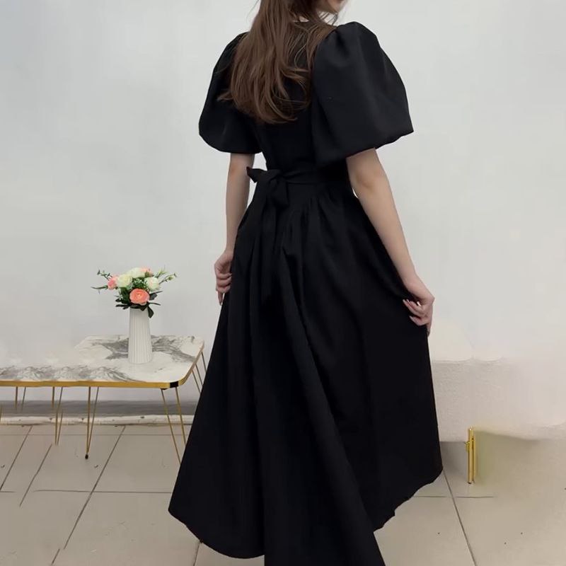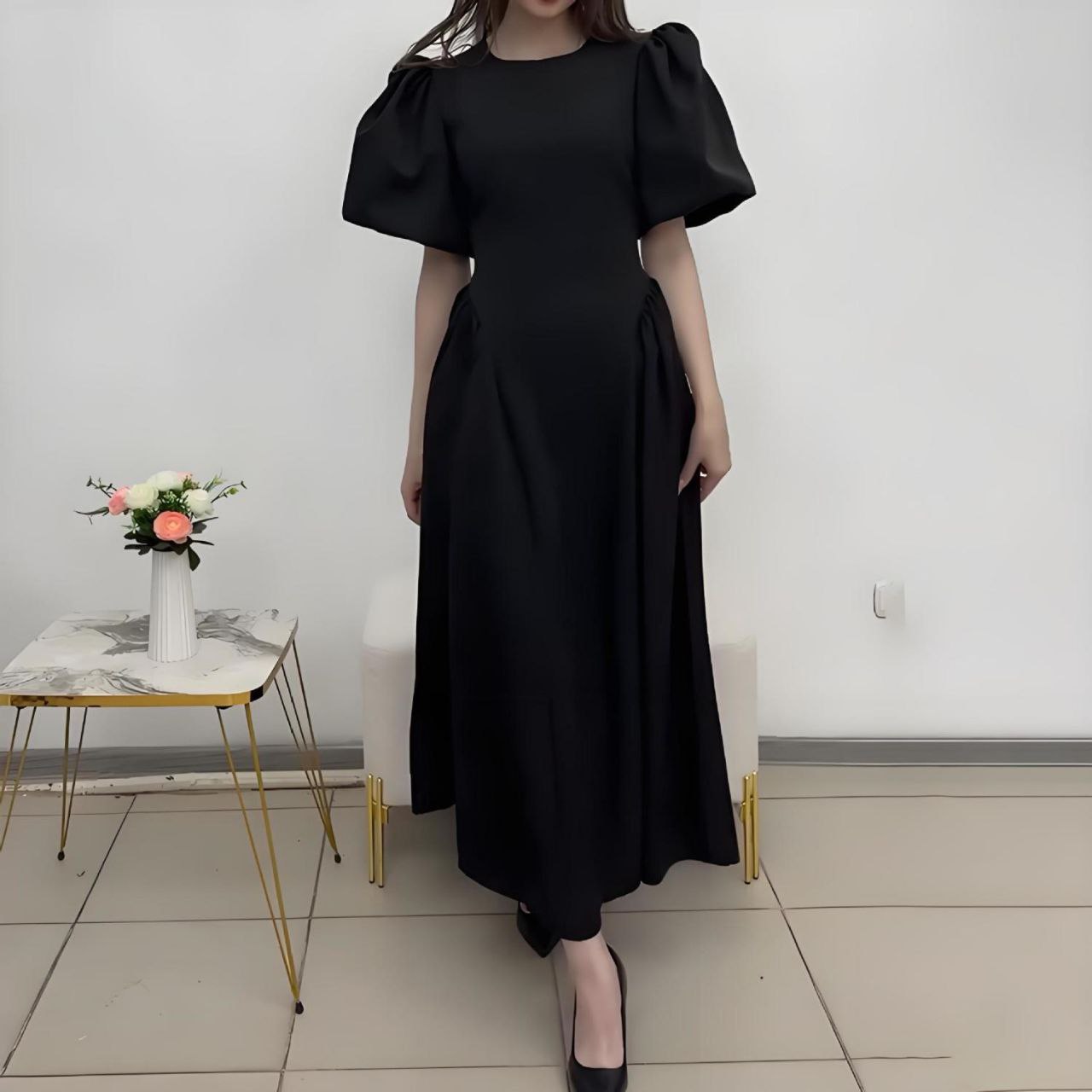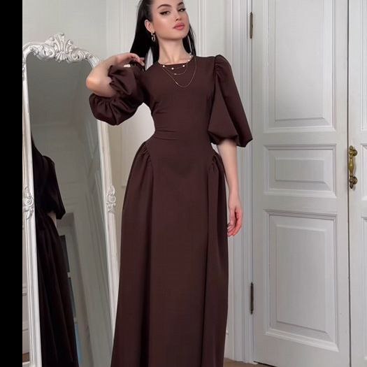 Элегантное женское платье длины макси, создающее выразительный приталенный силуэт. Модель отличается пышными рукавами-фонариками длиной до локтя и закрытым круглым вырезом горловины. Крой юбки расширяется от линии талии, формируя мягкие складки. Сзади предусмотрен текстильный пояс на завязках, который позволяет регулировать степень прилегания по фигуре. Платье выполнено из плотной костюмной ткани, которая хорошо держит форму и устойчива к сминанию.