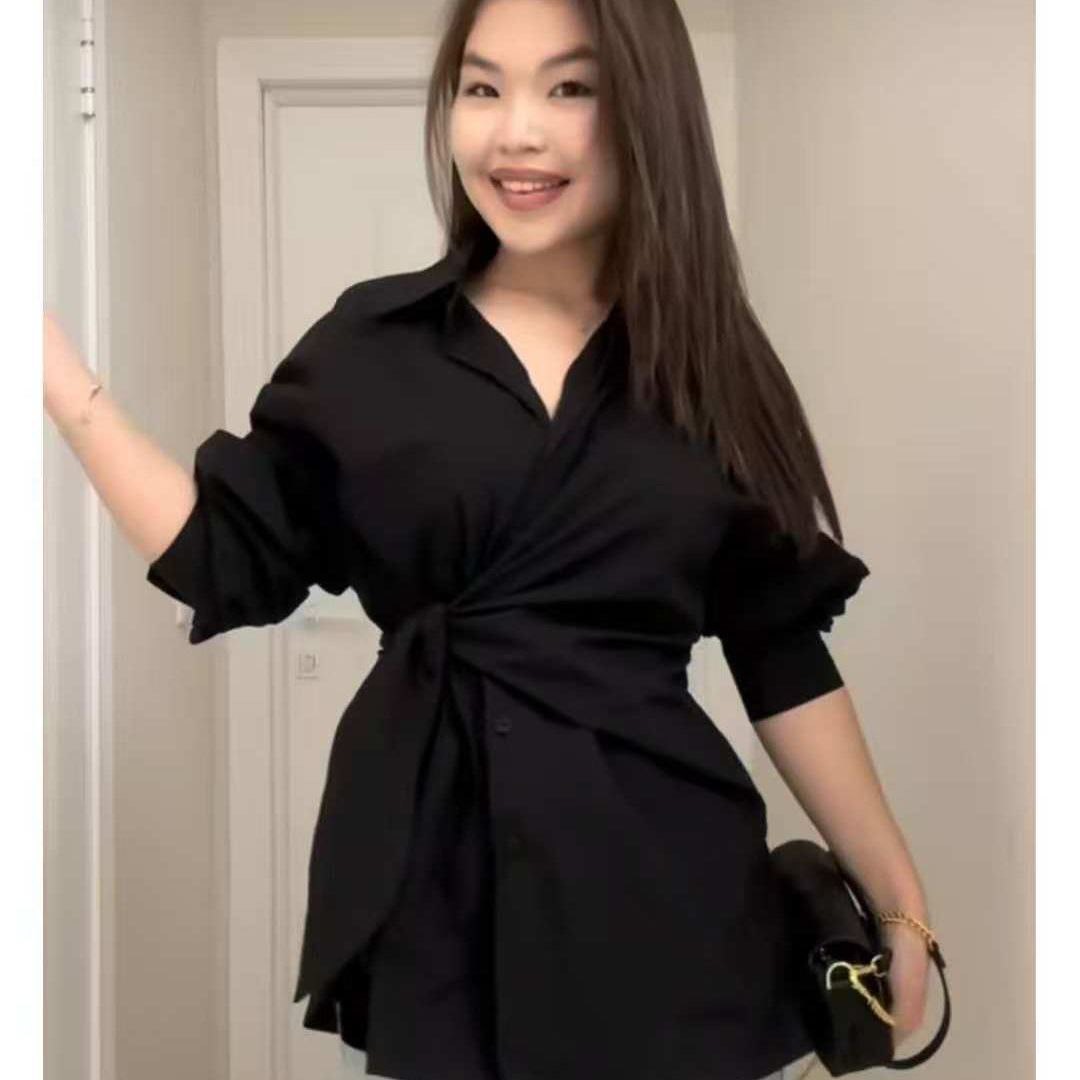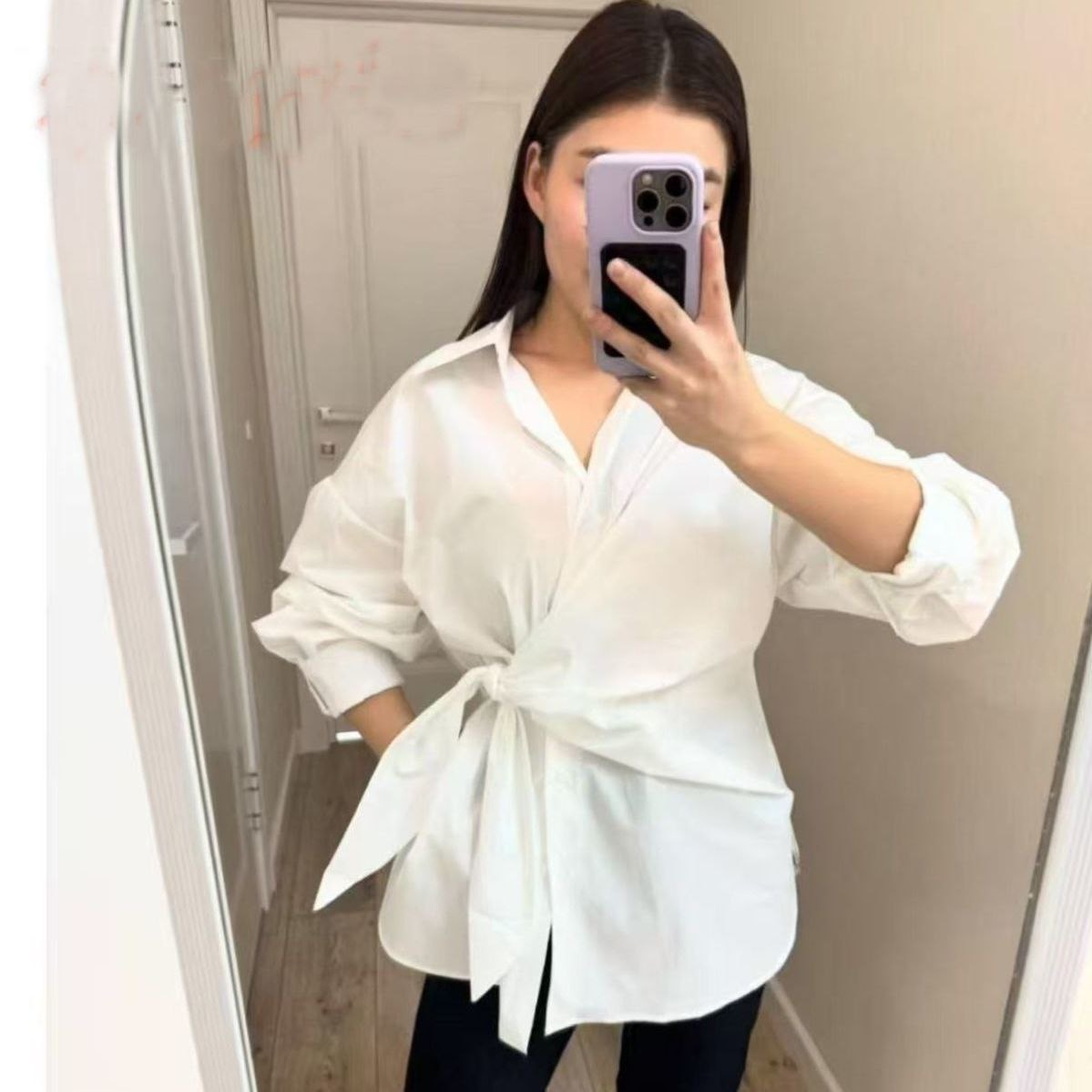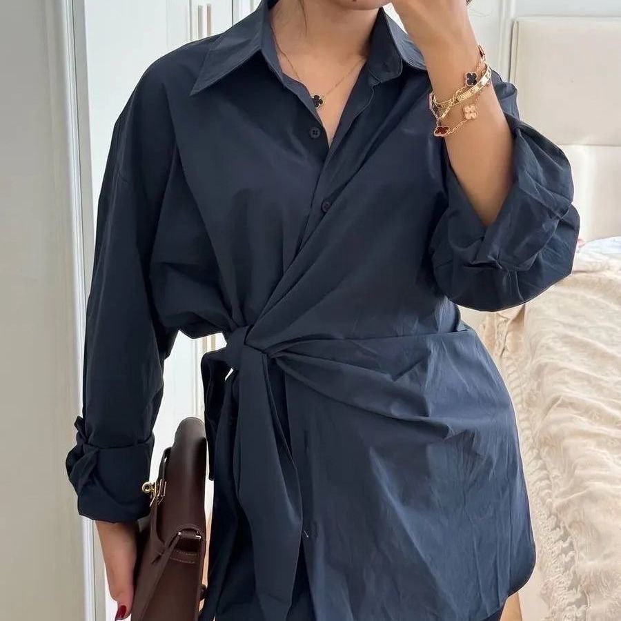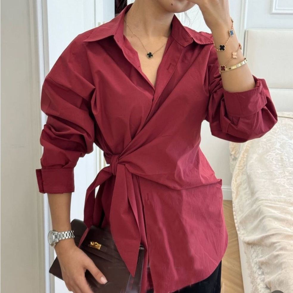 Женская рубашка с завязкой на талии. Модель выполнена в свободном крое, с длинными рукавами и отложным воротником. Особенность дизайна — узел на передней части, который подчёркивает силуэт и добавляет образу элегантности. Подходит для сочетания с брюками или юбками, создаёт как повседневный, так и нарядный образ.