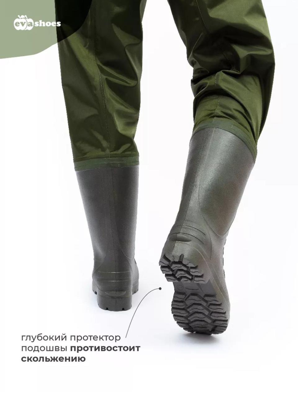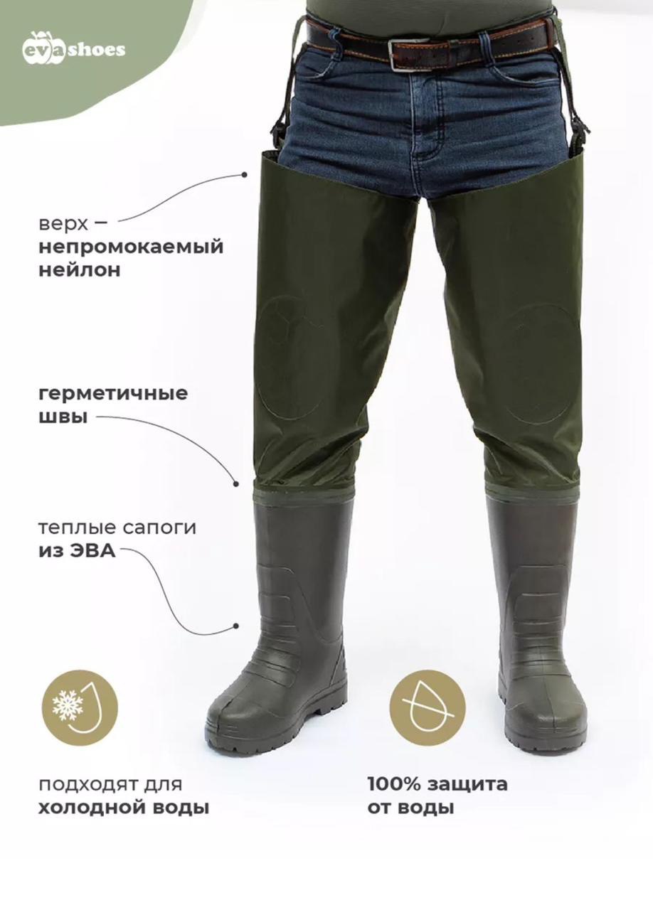 Идеальное решение для рыболовов, охотников и любителей активного отдыха у воды. Комбинированная конструкция сочетает прочность и комфорт: верх из непромокаемого нейлона надёжно защищает от влаги, а тёплые сапоги из ЭВА обеспечивают комфорт даже в холодной воде.