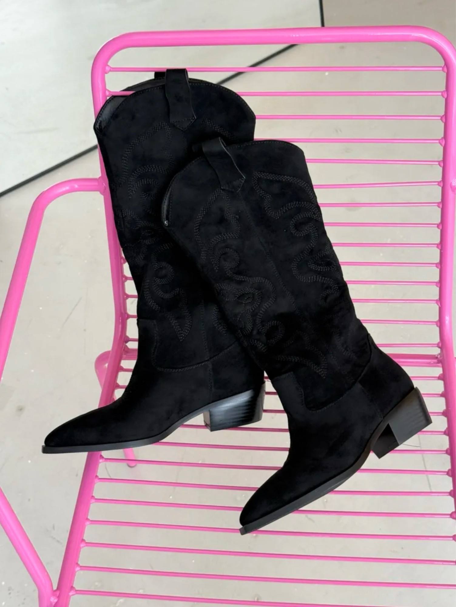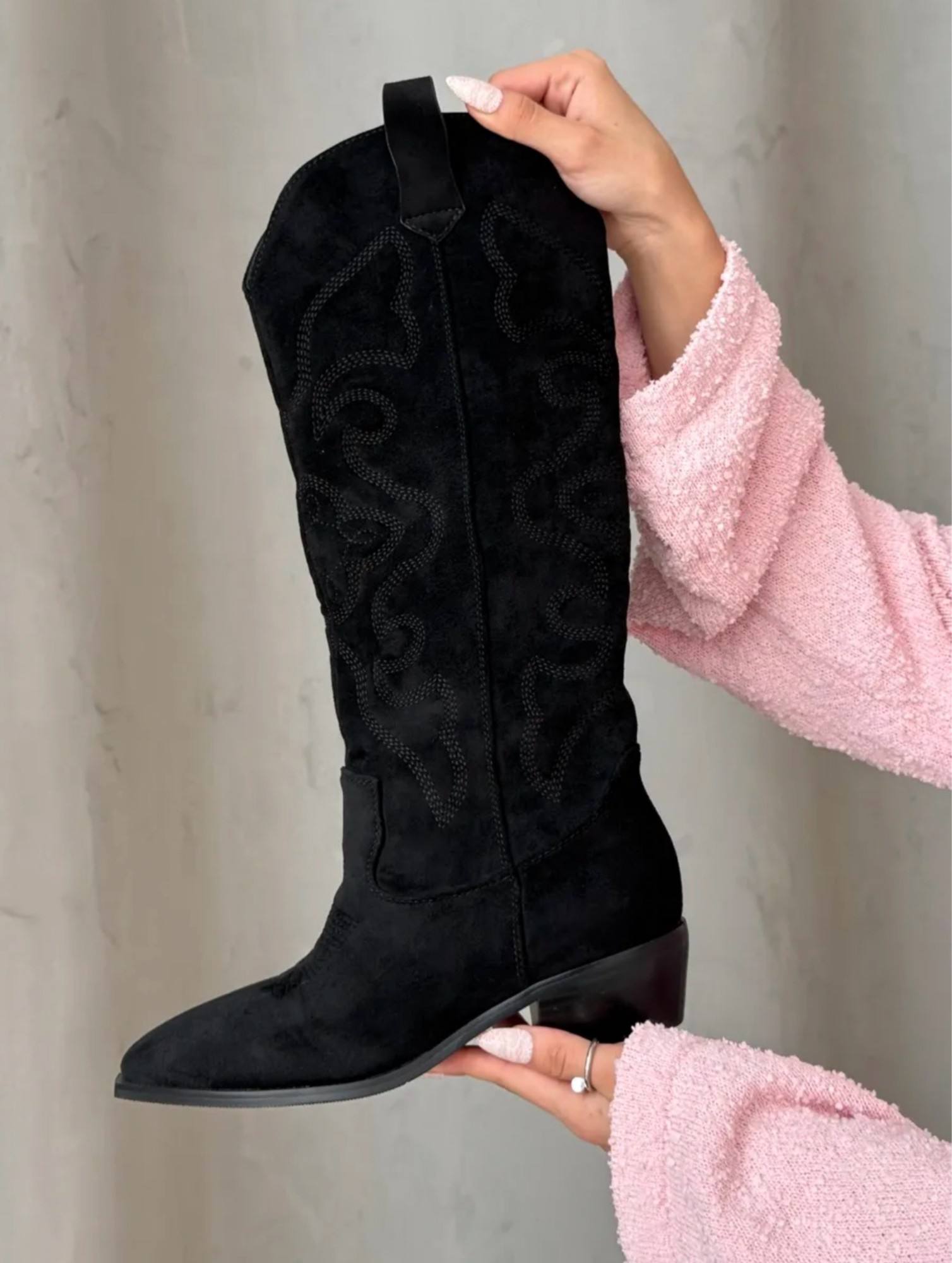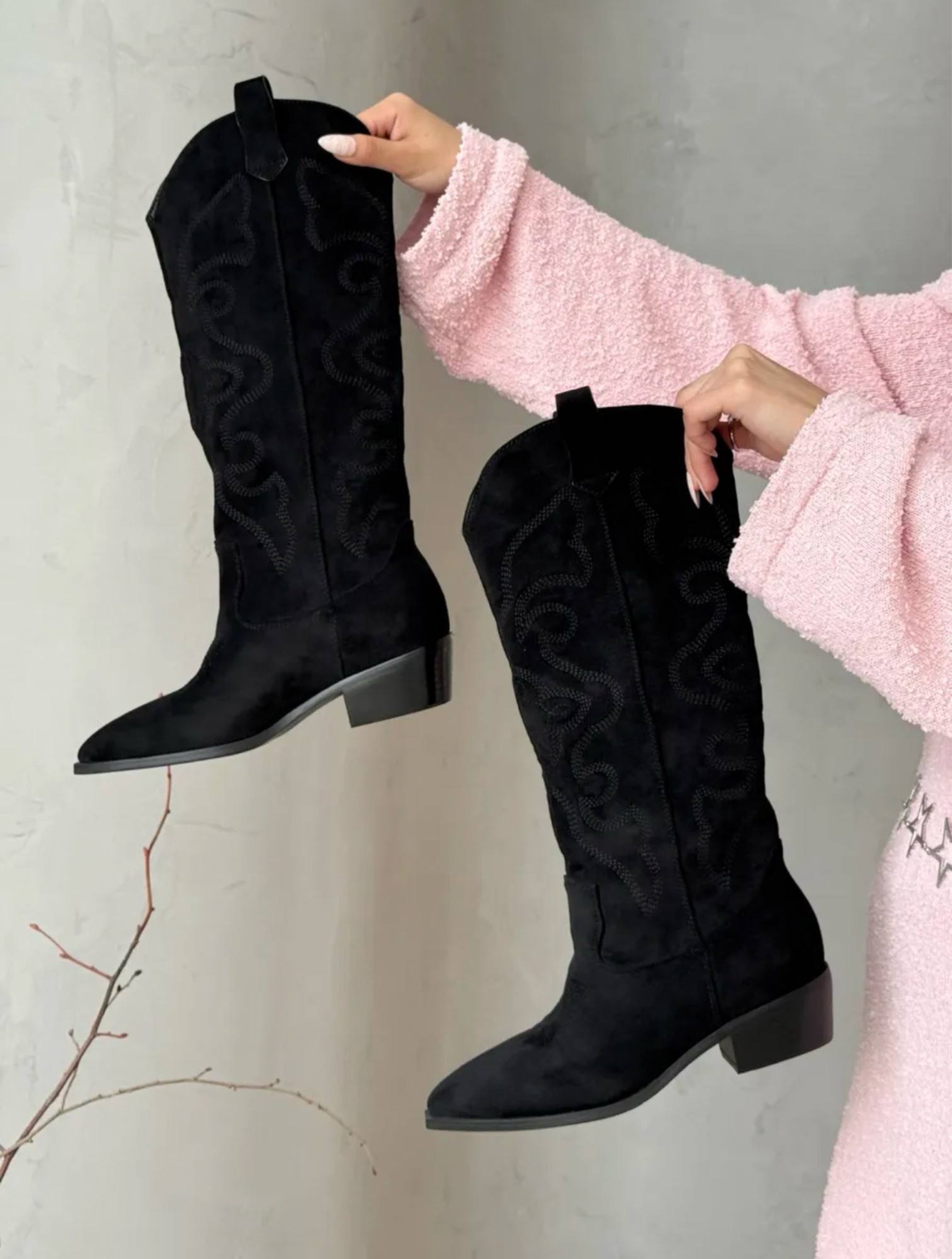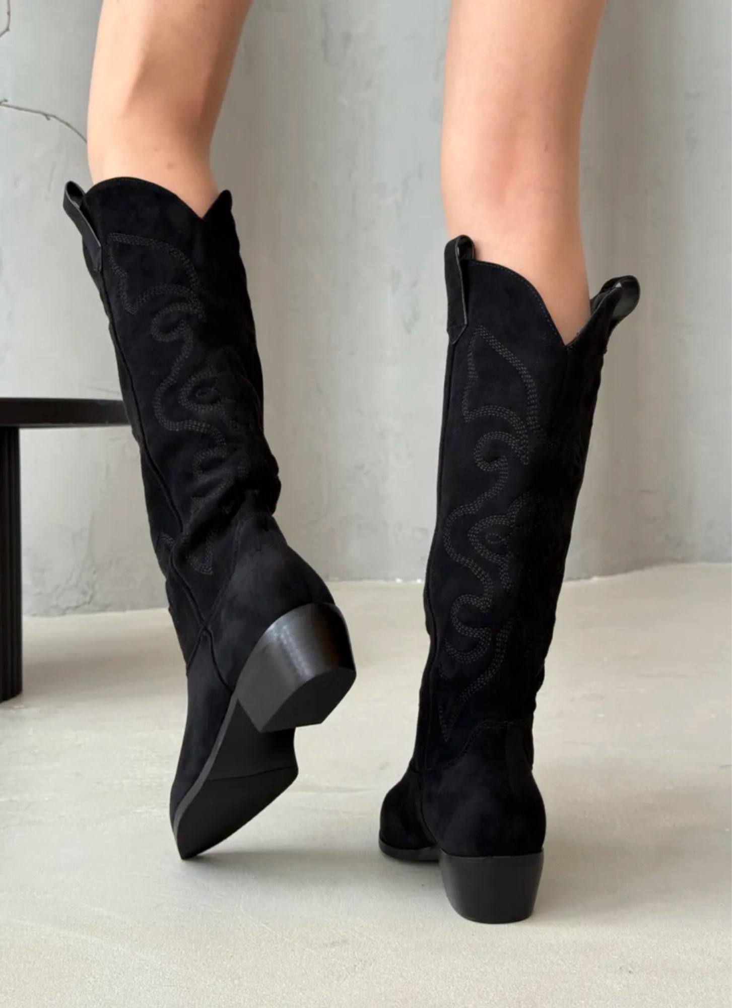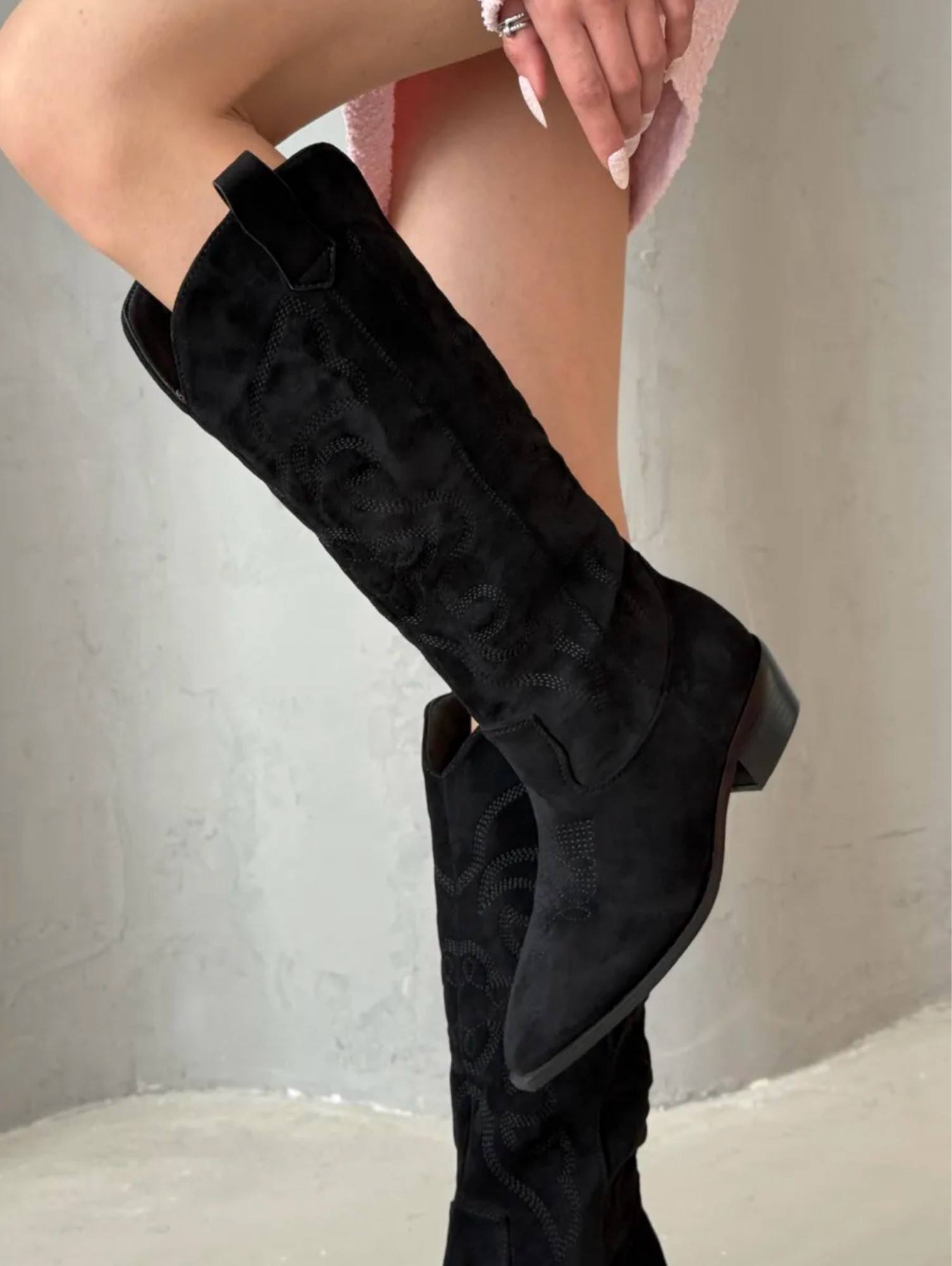 Женские замшевые сапоги-казаки чёрного цвета. Модель отличается классическим дизайном: заострённый носок, устойчивый низкий каблук, характерная декоративная строчка по голенищу. Удобная застёжка-петля сзади обеспечивает лёгкость надевания. Элегантный и универсальный вариант для повседневных образов — сочетаются с джинсами, платьями и юбками.