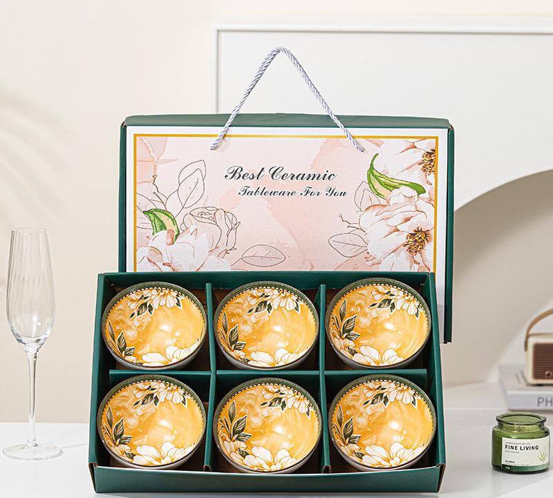 Тёплый янтарный фон в сочетании с нежными белыми цветами и зелёными листьями создаёт атмосферу уюта и гармонии. Пиалы аккуратно уложены в стильную подарочную коробку с ручкой — такой набор станет прекрасным презентом или украшением вашей кухни. Практичная и прочная керамика сочетает в себе эстетику и функциональность: подойдёт как для супов и каш, так и для десертов или закусок.