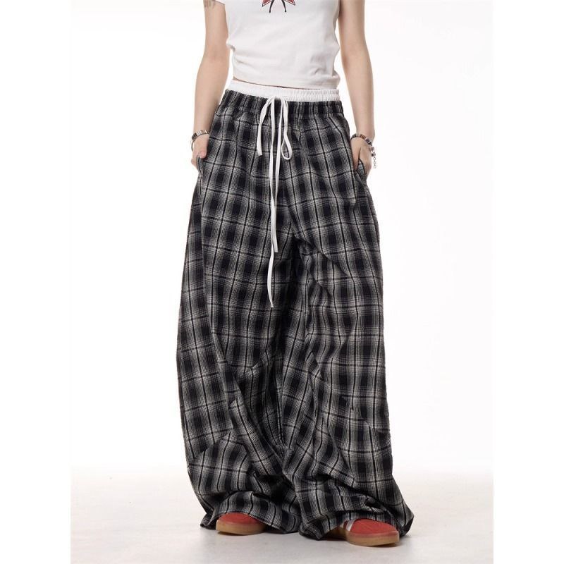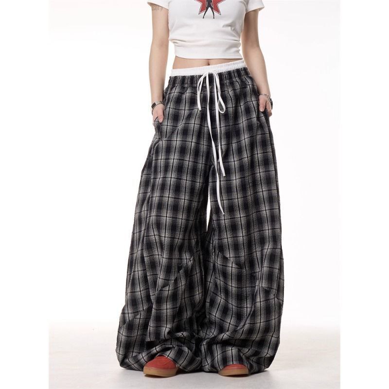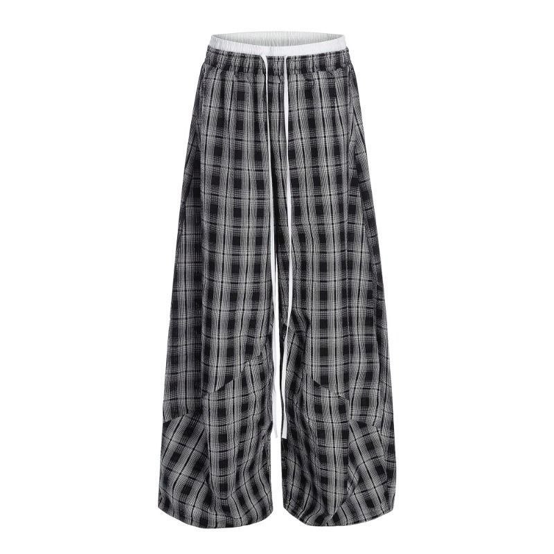 Широкие брюки в клетку с эластичным поясом и завязками. Выполнены в классическом чёрно-белом клетчатом принте, который придаёт модели универсальность и стильный вид. Свободный крой обеспечивает комфорт и свободу движений, а высокая посадка подчёркивает талию. Белый внутренний пояс добавляет контрастный акцент. Подойдут для повседневного ношения, домашних образов или расслабленных уличных луков.