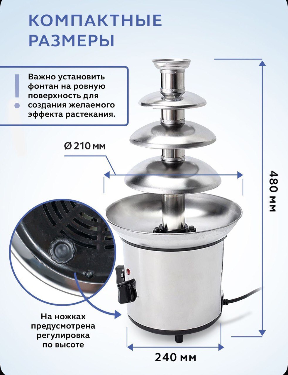 • 4-ярусный каскад: Обеспечивает равномерное распределение шоколада и создает потрясающий визуальный эффект.
