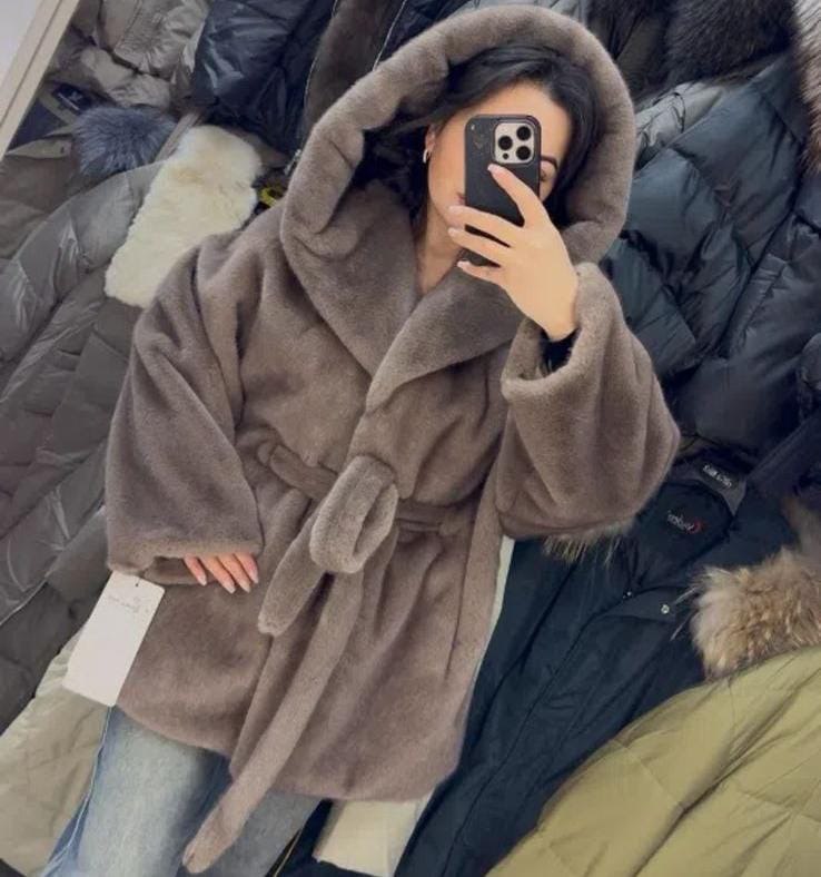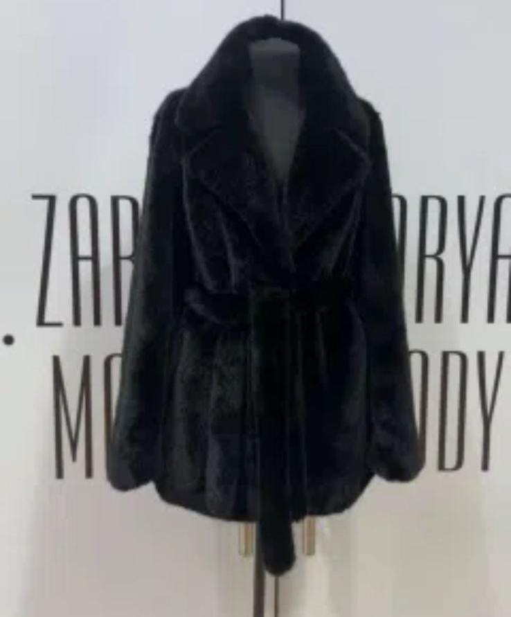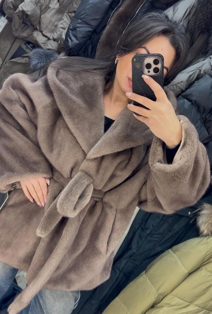 Шуба из экомеха. Модель выполнена в классическом стиле с прямым кроем, не сковывающим движения. Отличительная особенность — пояс из того же материала, который подчёркивает линию талии и создаёт женственный силуэт. Воротник широкий, придаёт изделию элегантность.
