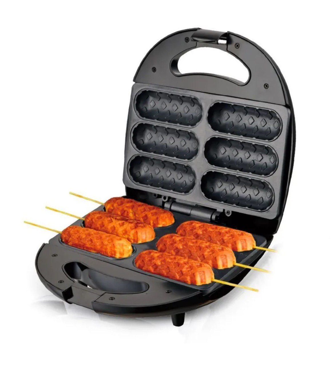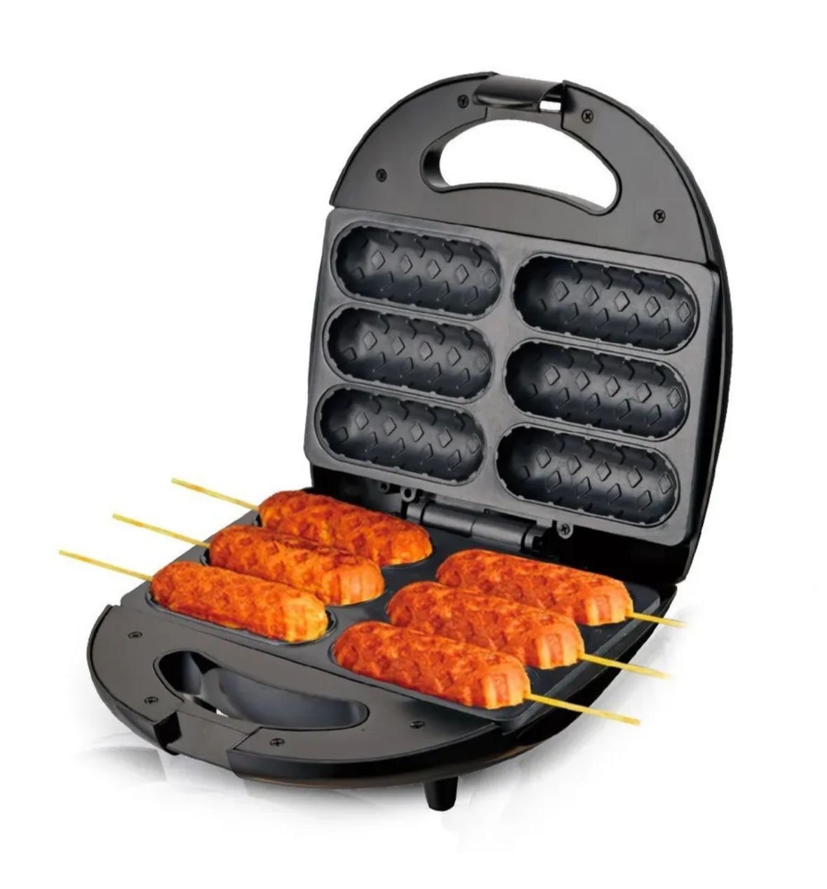 • Быстро и легко: Приготовление корн-догов никогда не было таким простым! Просто подготовьте тесто, вставьте сосиски на палочках, залейте тестом и закройте крышку. Через несколько минут – готово!