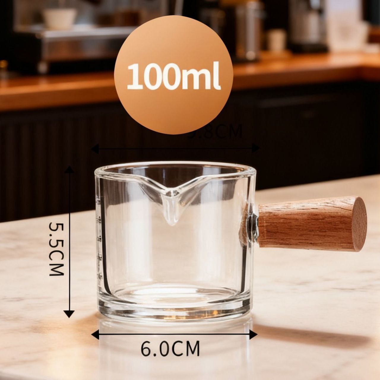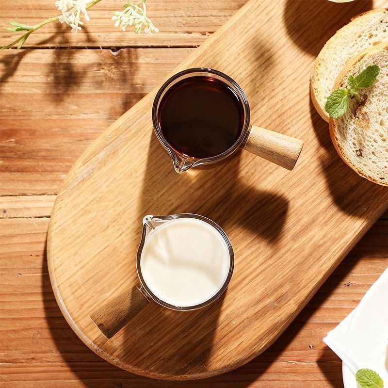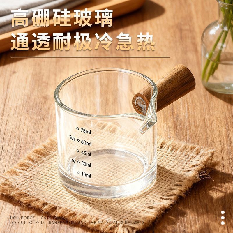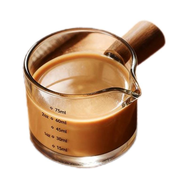 Стеклянная мерная чашка с деревянной ручкой, предназначенная для точного дозирования жидкостей — например, для приготовления эспрессо или других напитков. На стенках нанесена шкала с делениями в миллилитрах (до 75 мл) и унциях (до 2 oz), что позволяет быстро отмерять нужный объём. Эргономичная деревянная ручка обеспечивает удобный хват и защищает от нагрева. Имеется небольшой носик для аккуратного наливания.