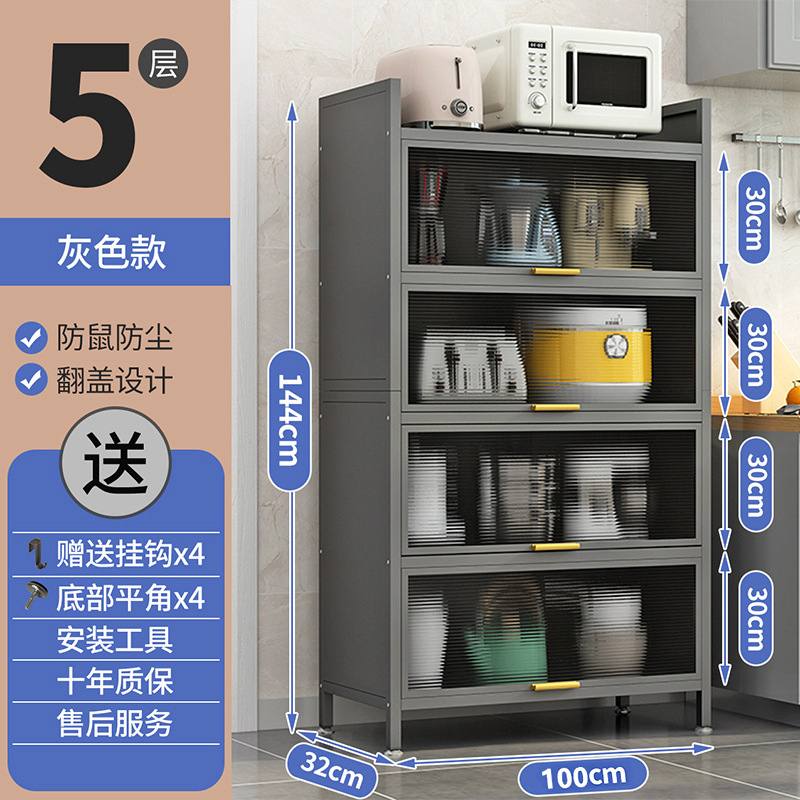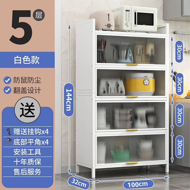 5 функциональных секций: 4 закрытых отделения с рифлёными стеклянными дверцами и просторная верхняя полка для мелкой бытовой техники (микроволновки, тостера и др.).