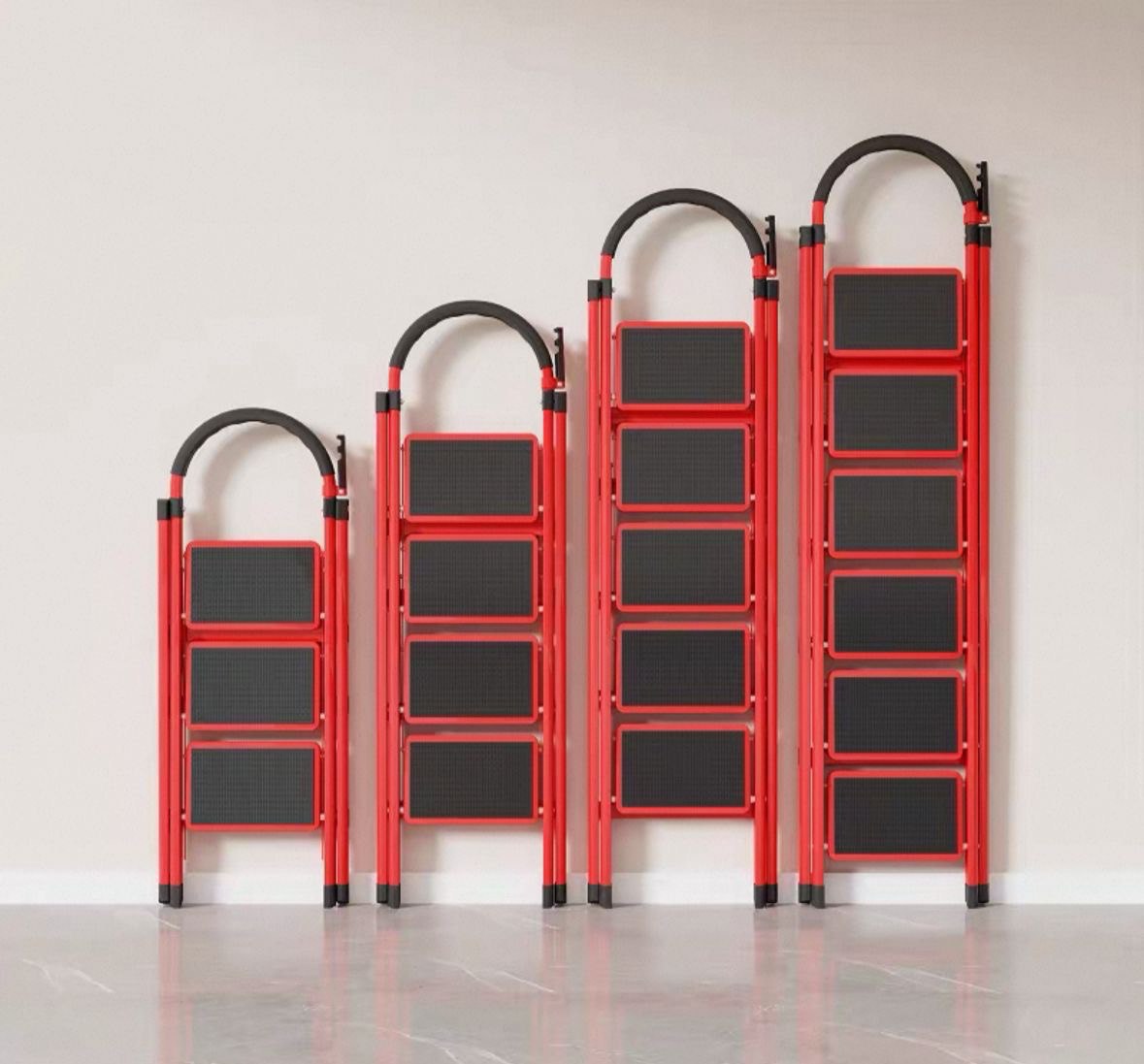 Практичные складные лестницы в ярком красном исполнении подойдут для домашних работ, ремонта, монтажа и уборки. Лёгкая конструкция сочетается с высокой надёжностью — идеальный выбор для дома и профессионального использования.