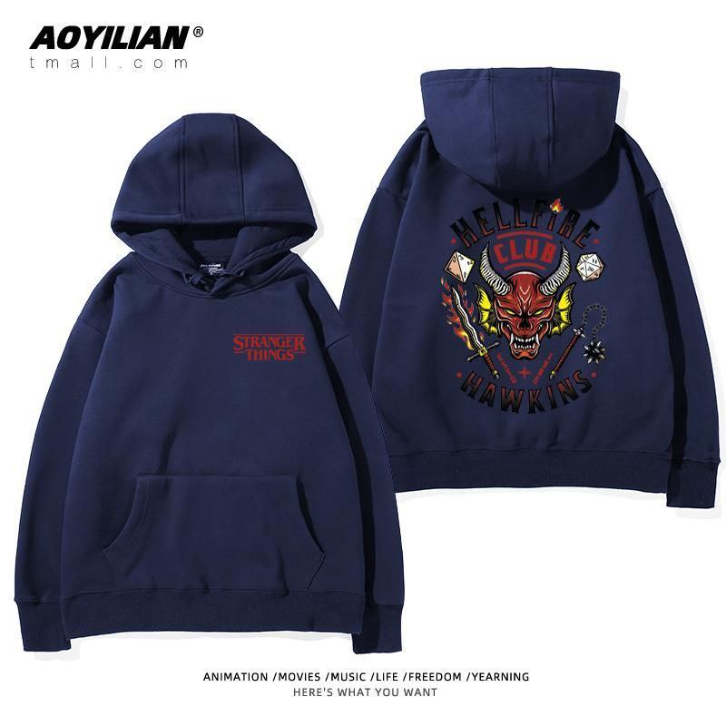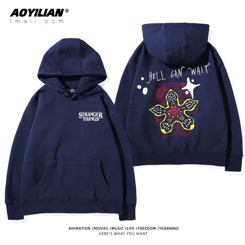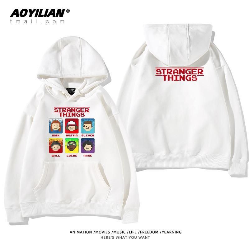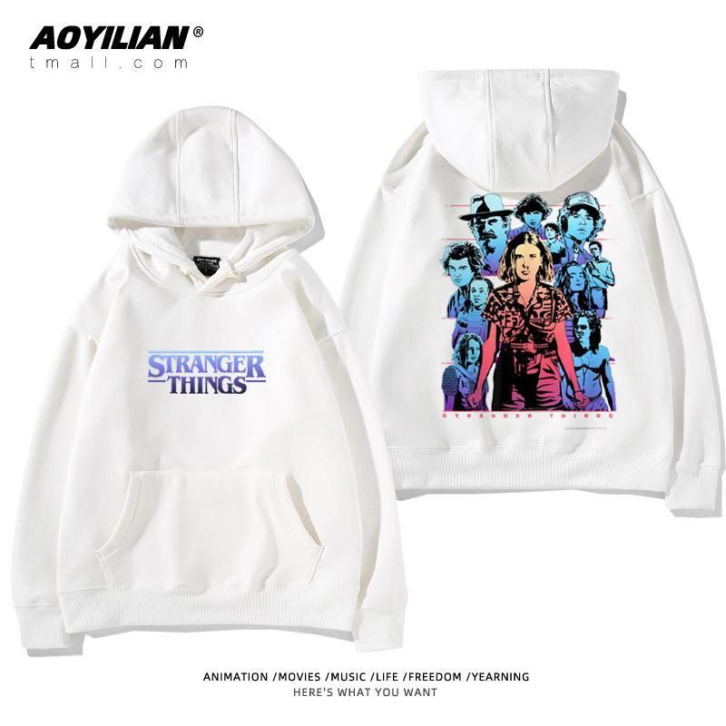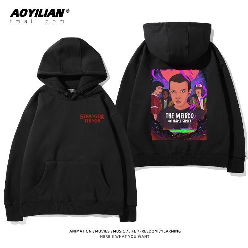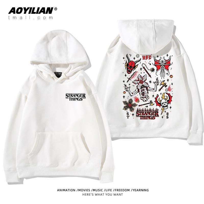 Свободная унисекс толстовка с капюшоном, выполненная в стиле оверсайз. Изделие имеет большой накладной карман-кенгуру, регулируемый капюшон на шнурках и эластичные манжеты. Главная особенность — яркие тематические принты, посвященные популярному сериалу "Очень странные дела" (Stranger Things), расположенные на спине и спереди. Толстовка подходит для повседневной носки, создания стильных образов в стиле стритвир и для фанатов сериала.