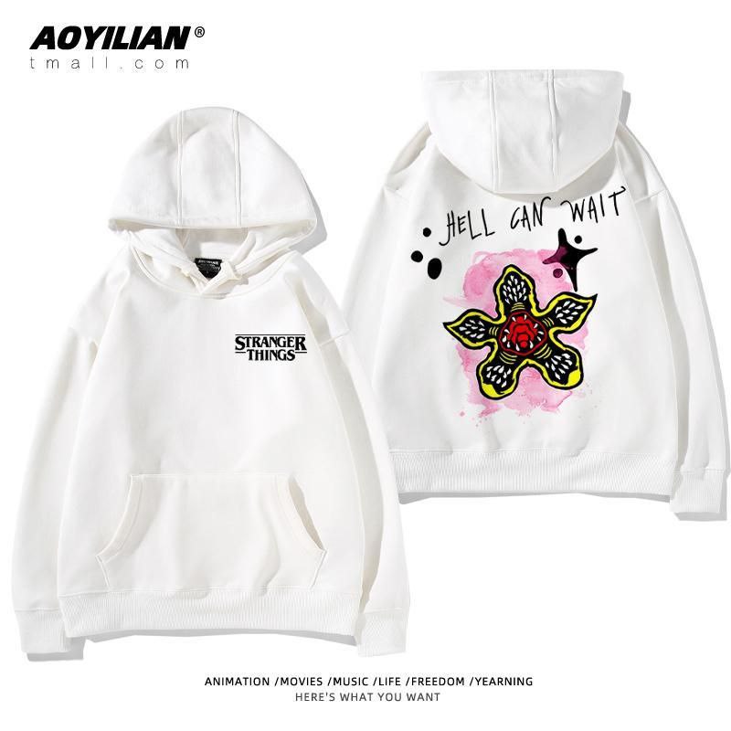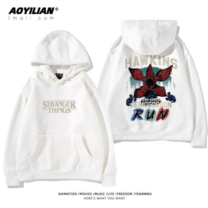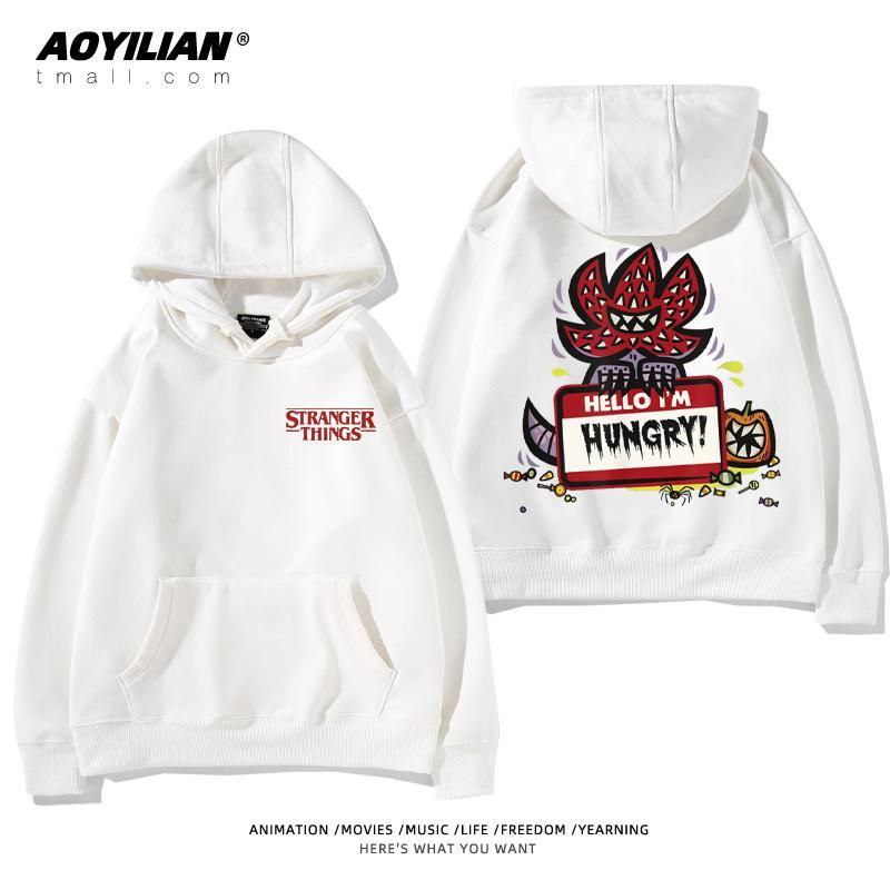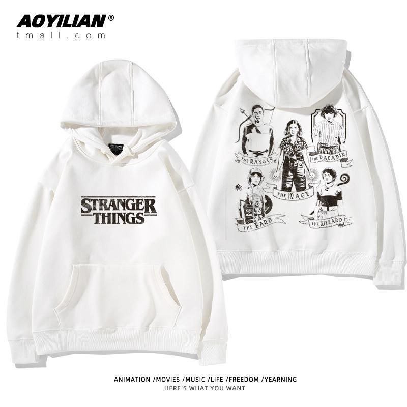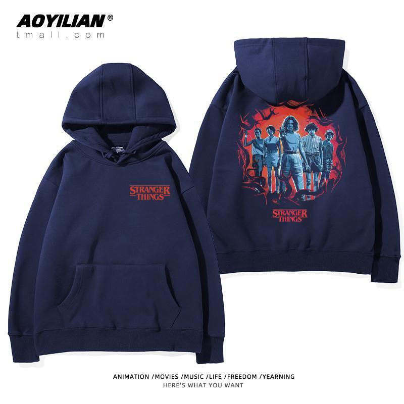 Свободная детская унисекс толстовка с капюшоном, выполненная в стиле оверсайз. Изделие имеет большой накладной карман-кенгуру, регулируемый капюшон на шнурках и эластичные манжеты. Главная особенность — яркие тематические принты, посвященные популярному сериалу "Очень странные дела" (Stranger Things), расположенные на спине и спереди. Толстовка подходит для повседневной носки, создания стильных образов в стиле стритвир и для фанатов сериала.