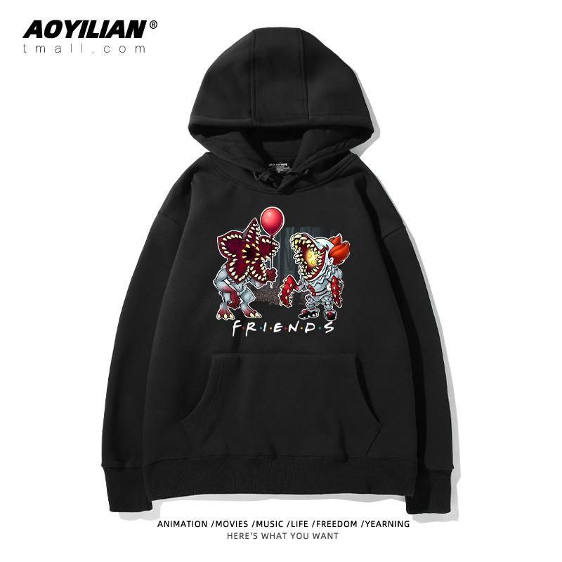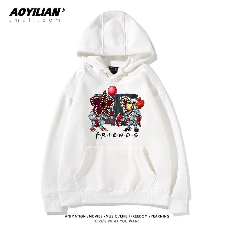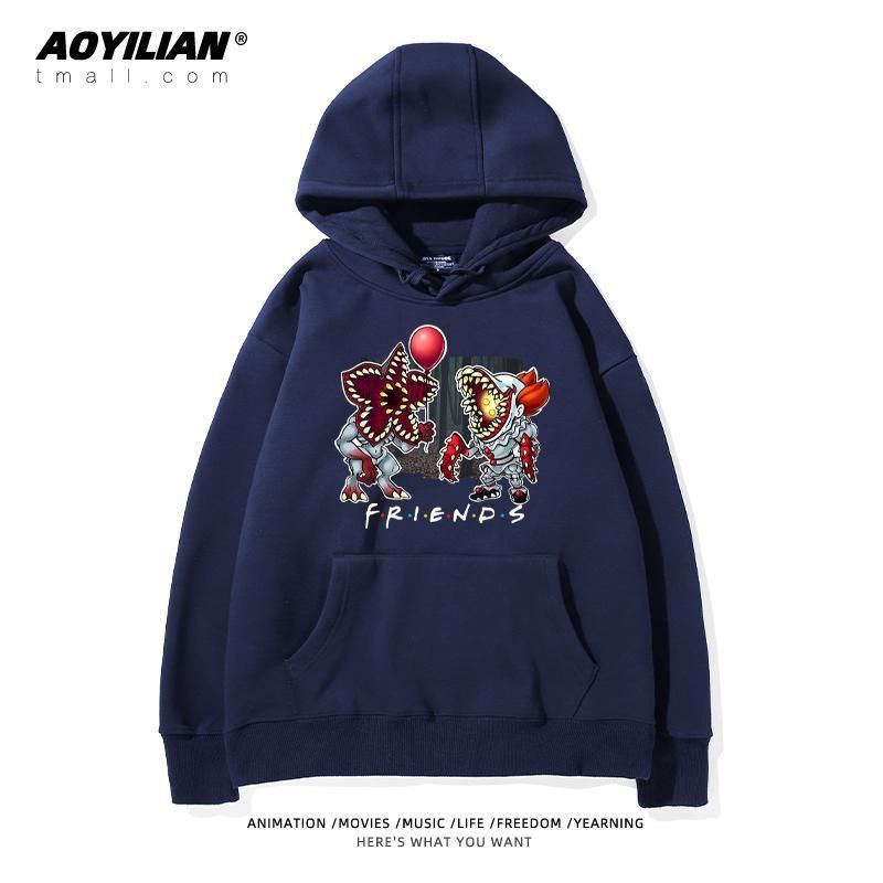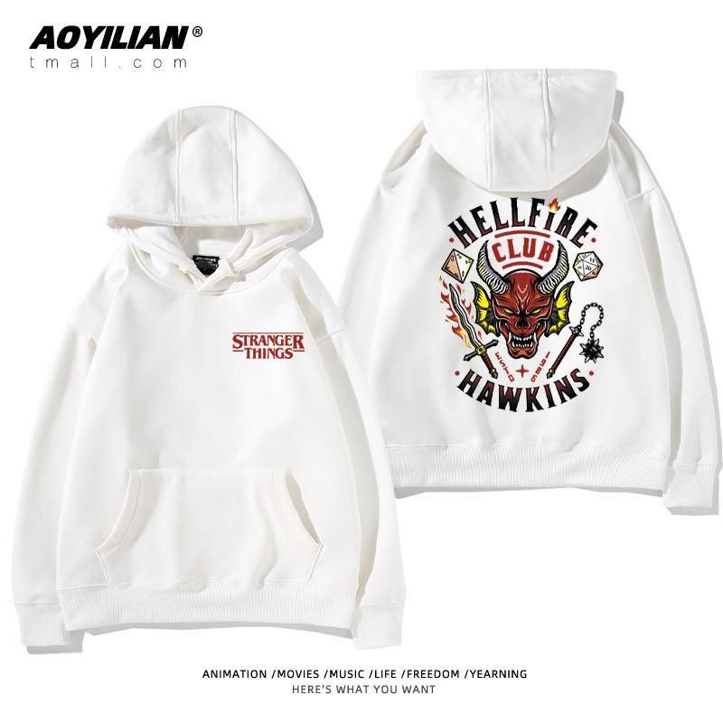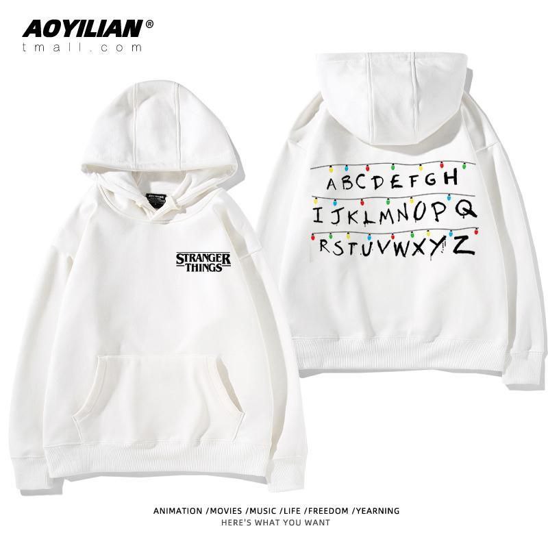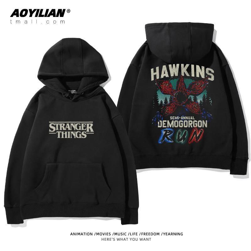Свободная детская унисекс толстовка с капюшоном, выполненная в стиле оверсайз. Изделие имеет большой накладной карман-кенгуру, регулируемый капюшон на шнурках и эластичные манжеты. Главная особенность — яркие тематические принты, посвященные популярному сериалу "Очень странные дела" (Stranger Things), расположенные на спине и спереди. Толстовка подходит для повседневной носки, создания стильных образов в стиле стритвир и для фанатов сериала.