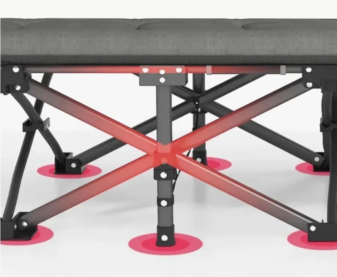 - Максимальная нагрузка: 200 кг. Раскладушка выдерживает значительный вес, обеспечивая надежность и безопасность.