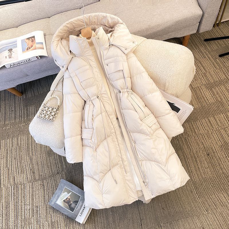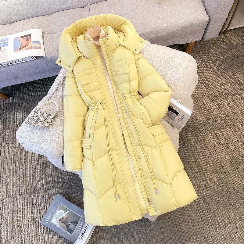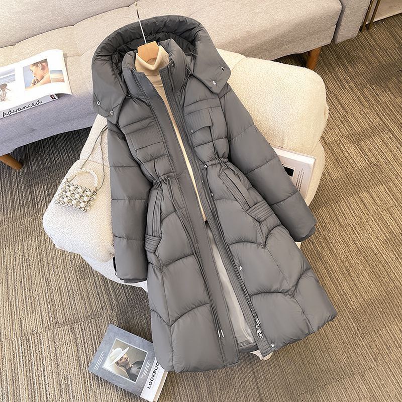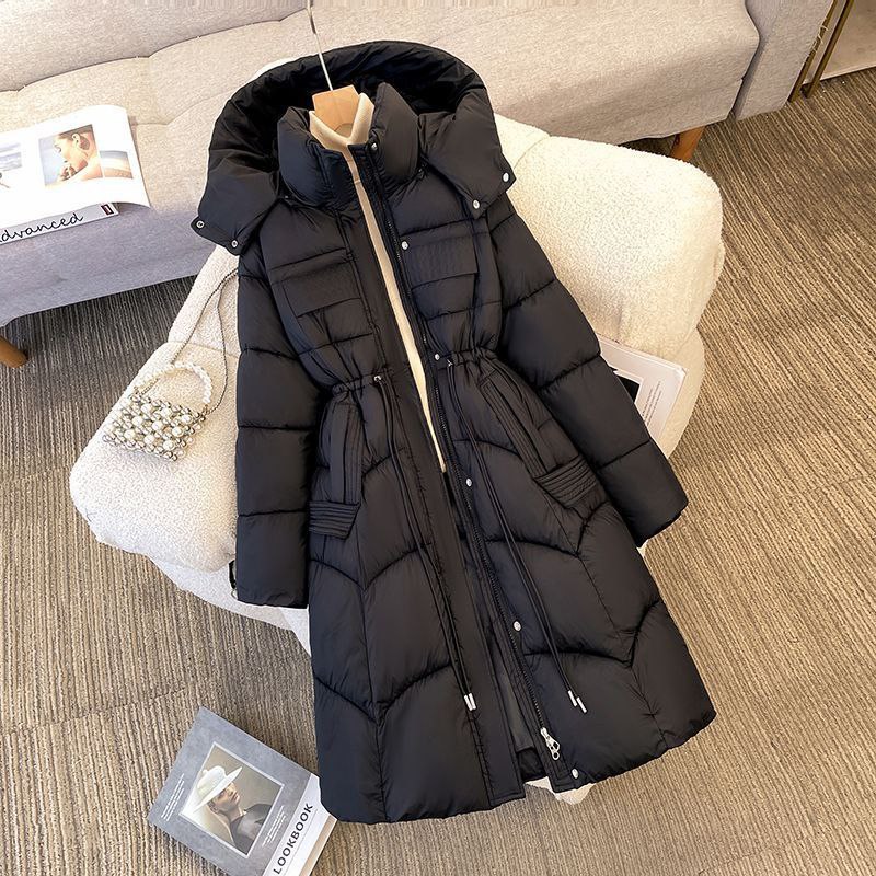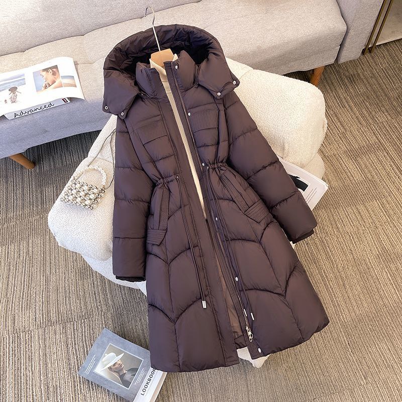 Удлинённый женский пуховик с капюшоном и поясом. Модель выполнена в лаконичном дизайне с фигурной стёжкой, имеет приталенный силуэт — пояс позволяет регулировать прилегание по талии. Пуховик застёгивается на молнию, капюшон оснащён утяжками для лучшей защиты от ветра и холода. Материал обеспечивает хорошую теплоизоляцию. Длина ниже колена делает модель практичной для холодной погоды. Сочетание элегантного внешнего вида и функциональности — удачный выбор для зимнего сезона.