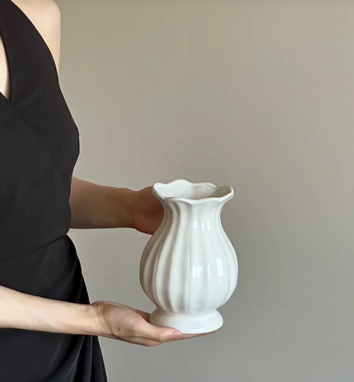 Заголовок: Белая керамическая ваза "Изящный букет" - 19.5 см, Рифленый Дизайн, Элегантность в каждой детали