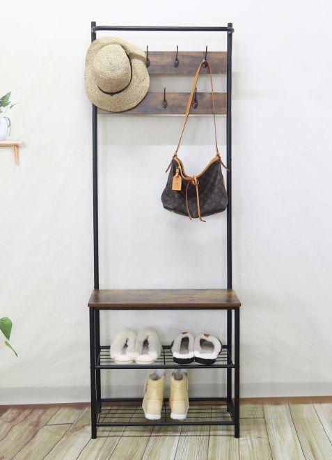 • Верхняя планка с крючками: Идеально подходит для подвешивания верхней одежды, сумок, шарфов, головных уборов. На фото показана стильная соломенная шляпа и сумка, демонстрируя потенциал использования.