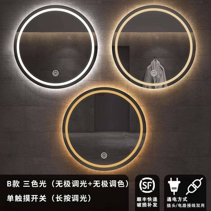 Предлагаемая модель — круглое зеркало B с интегрированной LED-подсветкой, продуманной до мелочей для комфортного повседневного использования. В центре нижней части зеркала расположен сенсорный выключатель с узнаваемым символом питания: одно касание включает/выключает свет, длительное нажатие регулирует яркость плавно (stepless dim). Дополнительно функция бесступенчатой смены цветовой температуры позволяет выбрать один из трёх режимов: тёплый (уютный), нейтральный (естественный) и холодный (рабочий) свет — удобно для макияжа, бритья и создания атмосферы.