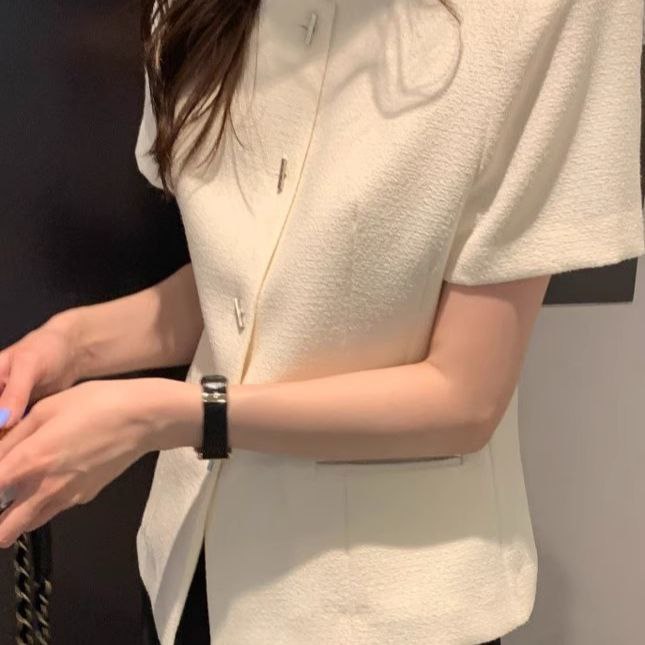 Выполнен в светлом, молочном оттенке, отличается лаконичным дизайном: застёгивается на пуговицы, оснащён двумя накладными карманами. Модель сочетает в себе строгость классического кроя и лёгкость за счёт укороченных рукавов — подойдёт для офисного и повседневного образа.