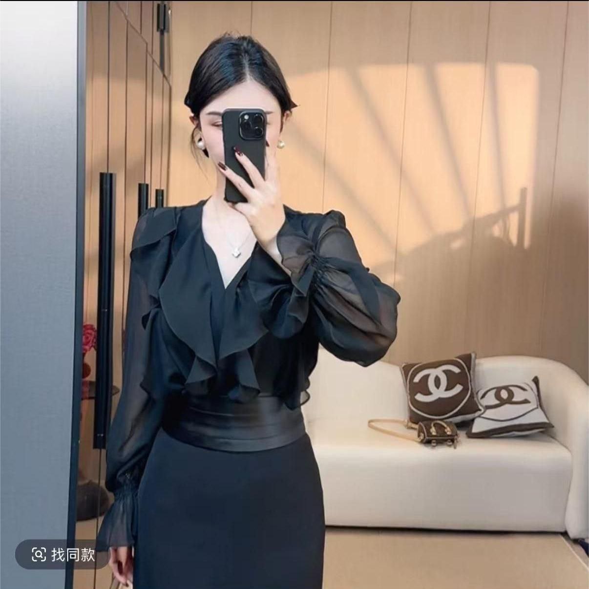 Элегантная женская блузка из лёгкого шифона. Модель отличается изысканным дизайном: глубокий V-образный вырез, объёмные оборки на груди и рукавах, длинные рукава с присборенной манжетой. Создаёт женственный и утончённый образ — подойдёт как для повседневных, так и для нарядных луков. Подходит для сочетания с классическими брюками, юбкой-карандашом или джинсами.