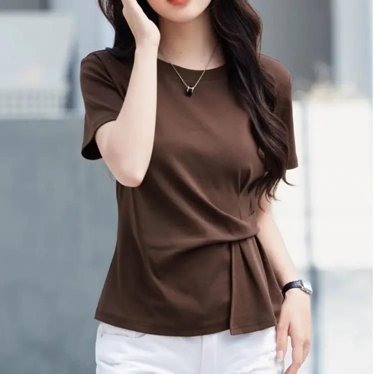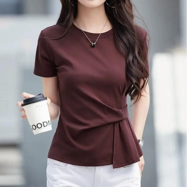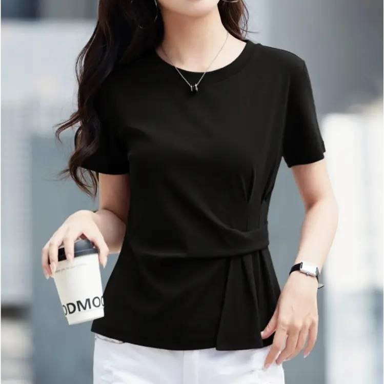 Женская футболка с коротким рукавом и круглым вырезом. Особенность модели — декоративный элемент в виде драпировки с узлом на талии, который придаёт изделию элегантность и подчёркивает фигуру. Футболка выполнена из мягкой ткани, комфортно облегает тело, не сковывая движений. Универсальный вариант для повседневных образов — легко сочетается с джинсами, юбками или брюками.