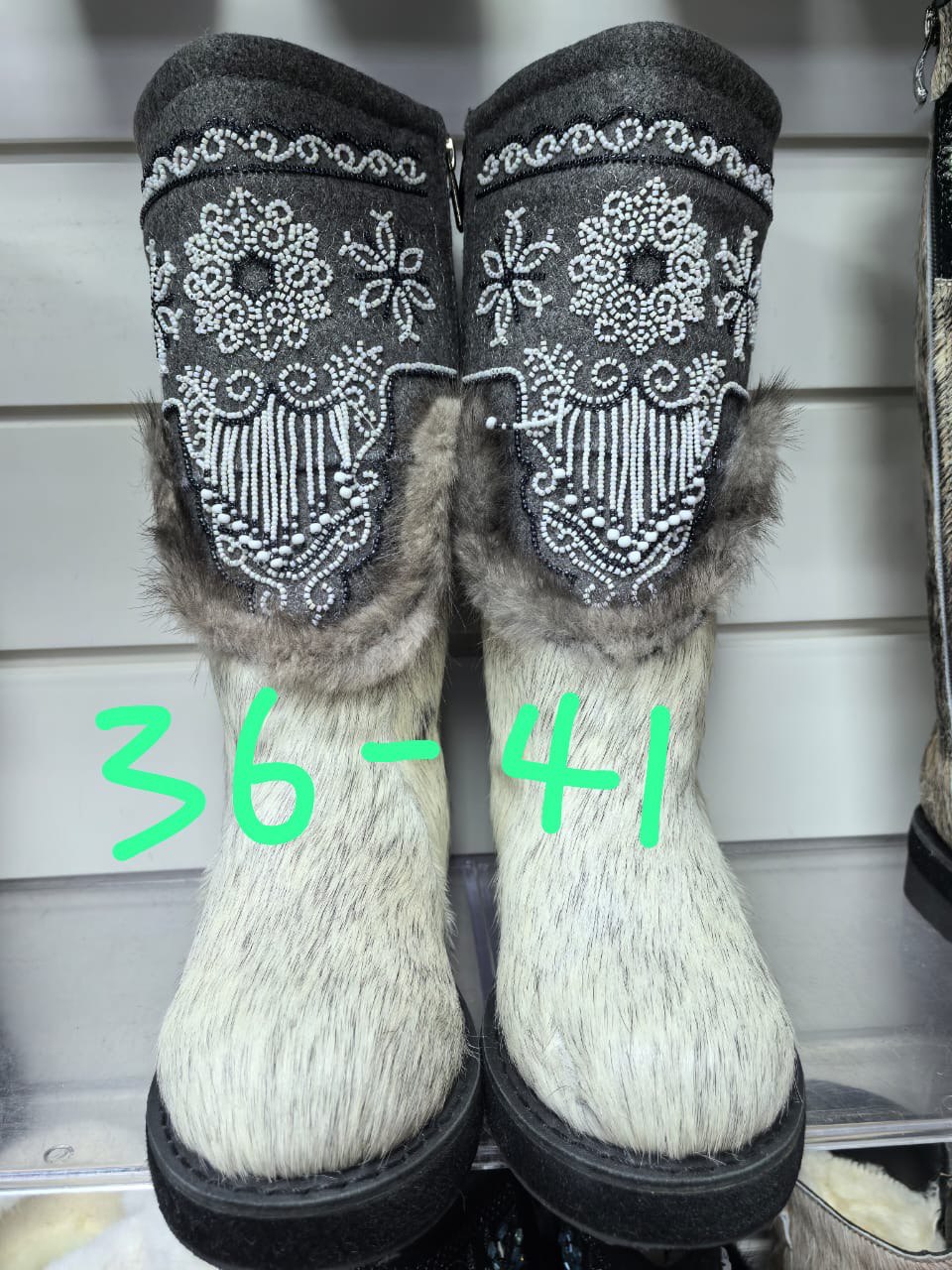 Изящные унты порадуют не только внешним видом, но и непревзойдённым комфортом в морозную погоду. Верх украшен изысканной вышивкой из бисера с национальным орнаментом — стильный акцент для зимнего образа.