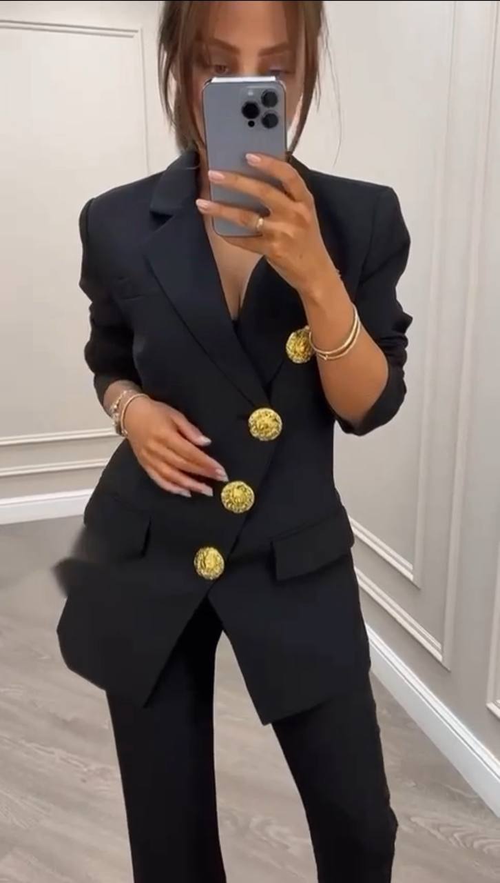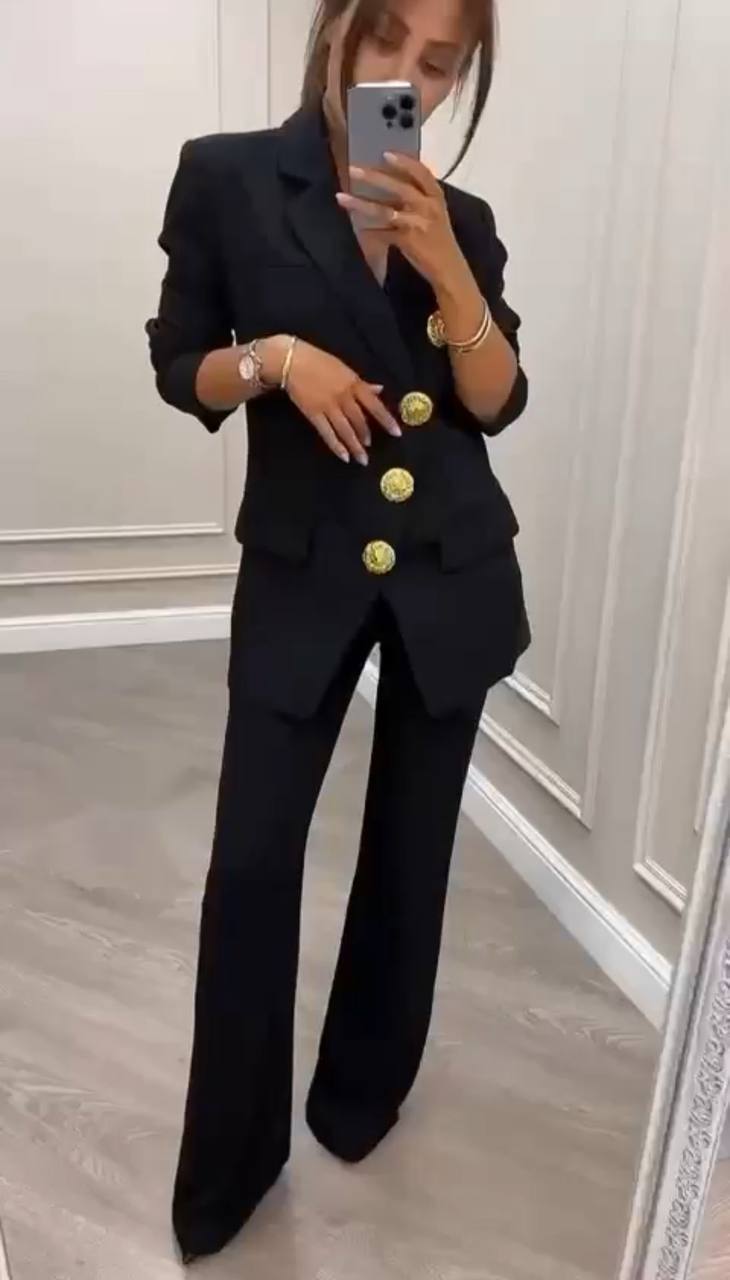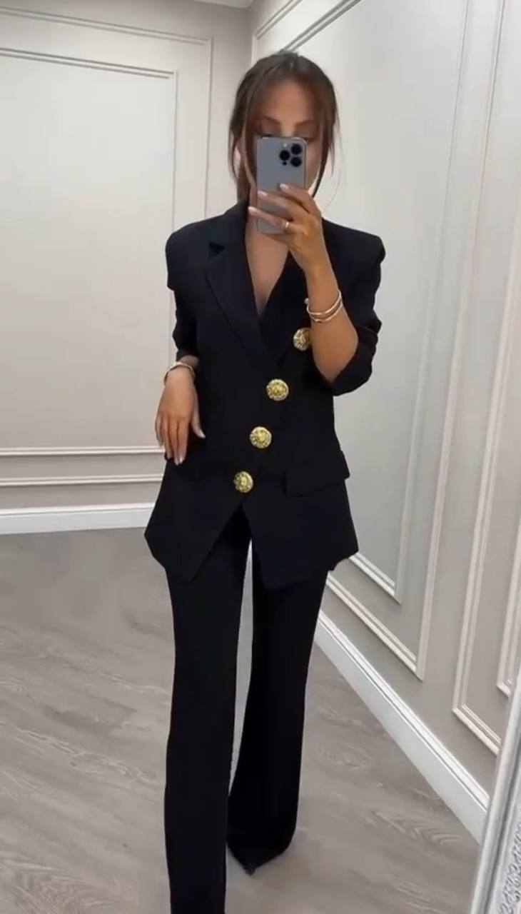 Женский брючный костюм чёрного цвета с выразительными золотыми пуговицами. Ткань: барби люкс. Комплект состоит из приталенного пиджака с классическим отложным воротником и брюк-палаццо с высокой посадкой. Пиджак застёгивается на три крупные декоративные пуговицы, рукава — длиной три четверти. Модель подчёркивает фигуру, визуально вытягивает силуэт. Подходит для делового и вечернего образа.