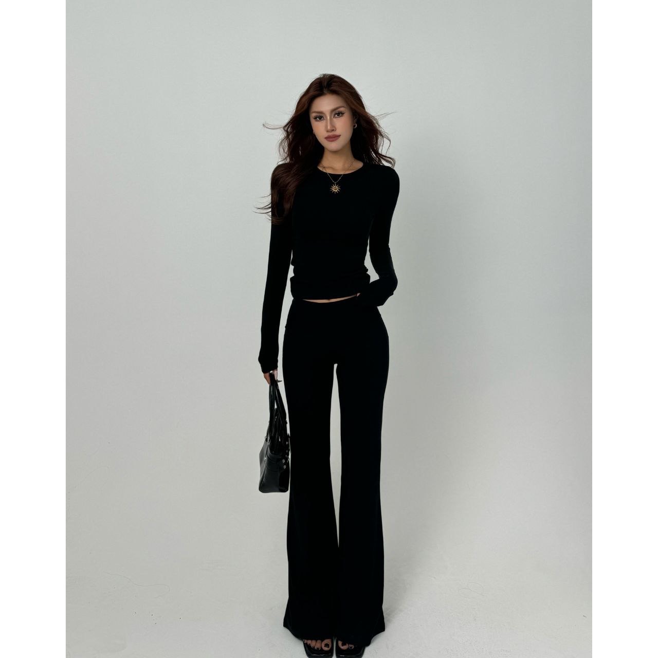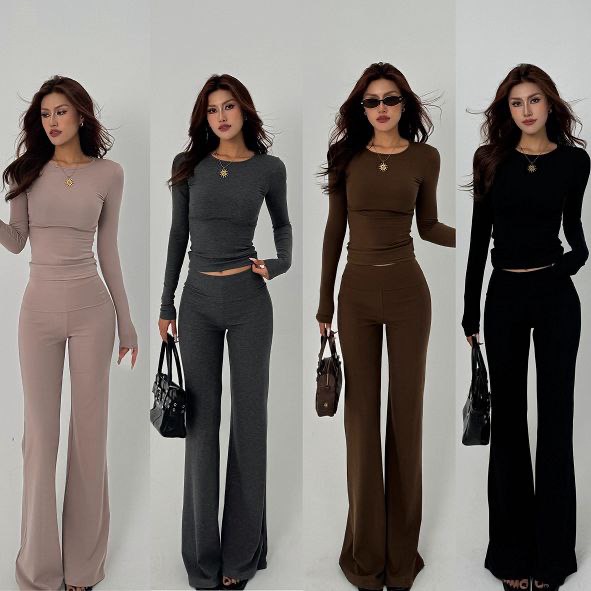 Женский комплект из двух предметов: облегающий топ с длинными рукавами и брюки-клёш. Модель выполнена в минималистичном стиле — лаконичный крой, отсутствие декора, акцент на чистых линиях. Топ приталенный, с округлым вырезом, брюки имеют высокую посадку и плавно расширяются книзу.