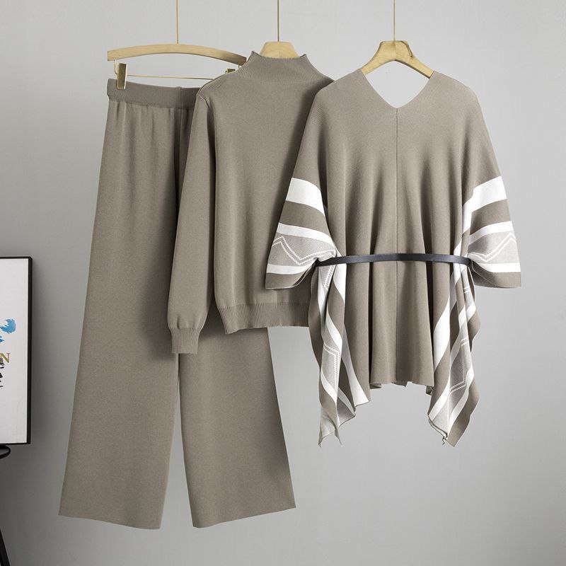 Женский комплект из трёх предметов: широких брюк, свитера с высоким воротом и вязаного кардигана-шали. Выполнен в спокойном оттенке с декоративными вставками на кардигане.