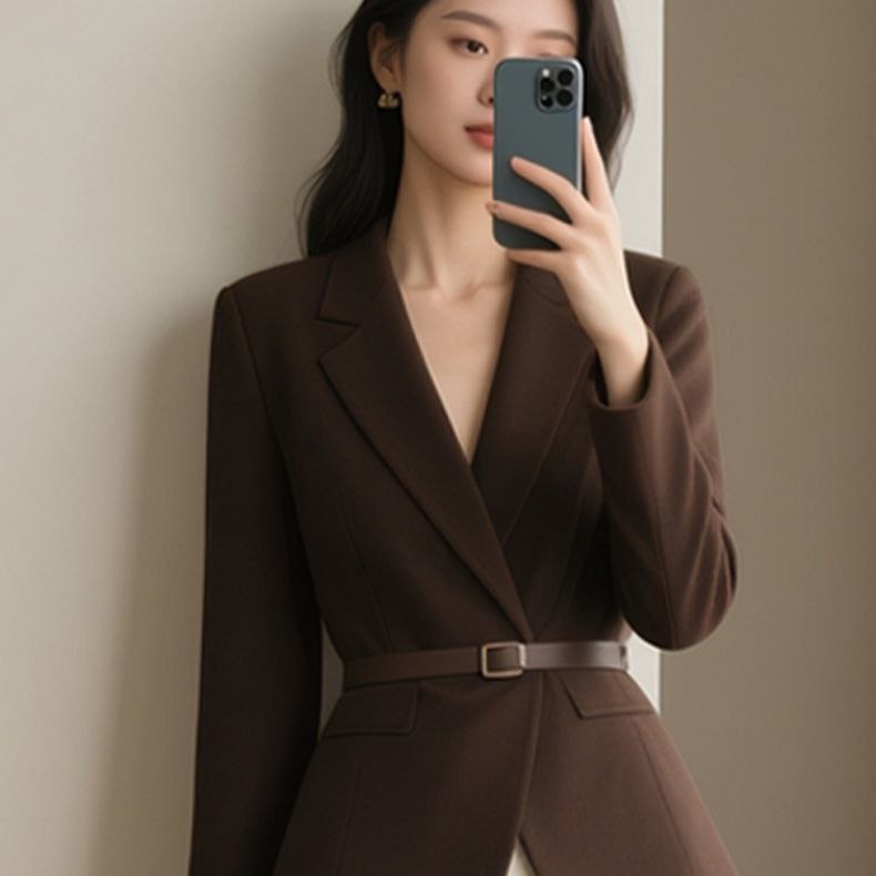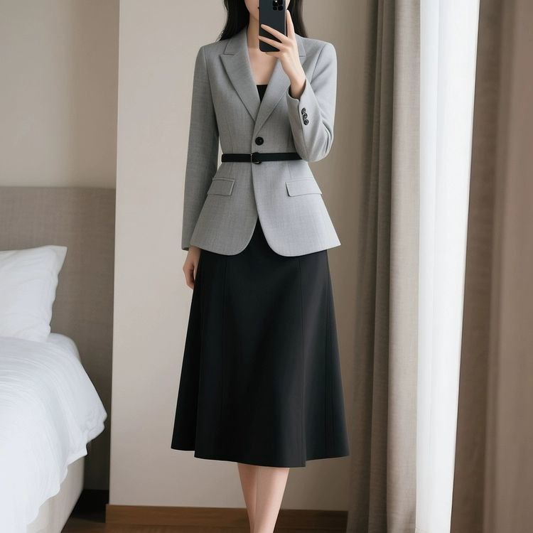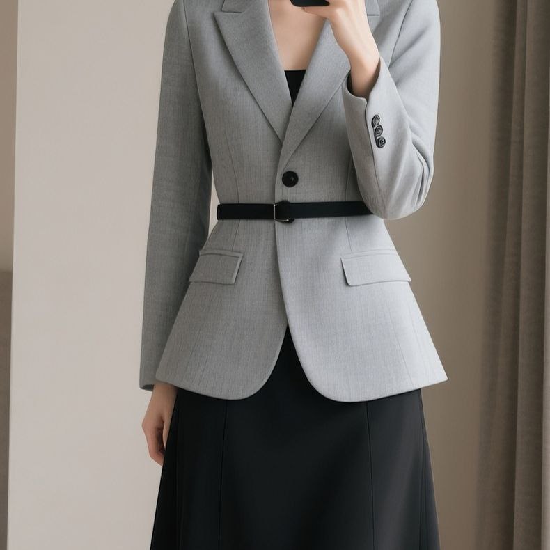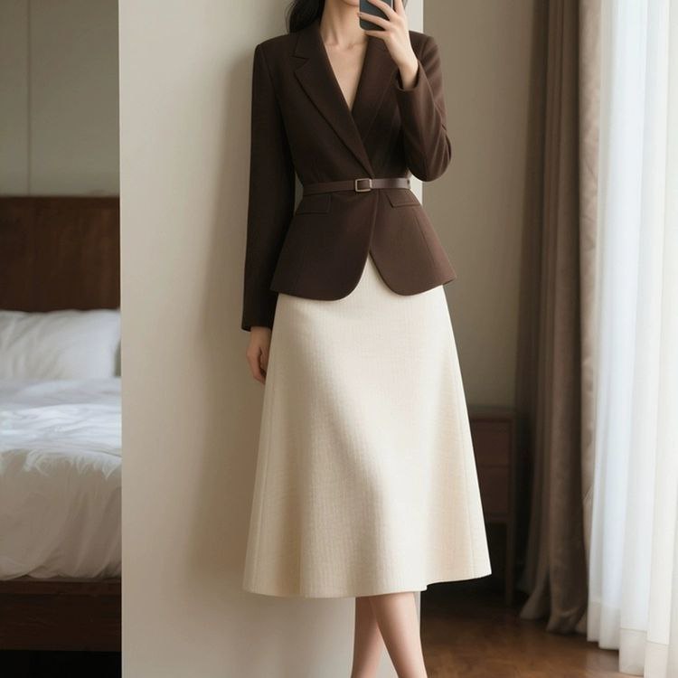 Элегантный женский костюм, состоящий из пиджака и юбки миди. Пиджак с классическим кроем, отложным воротником и одной пуговицей; дополнен поясом, подчёркивающим талию. Юбка прямого кроя, с завышенной талией — создаёт сбалансированный контраст с верхом. Комплект выглядит лаконично и стильно, подходит для офисного стиля или деловых встреч.