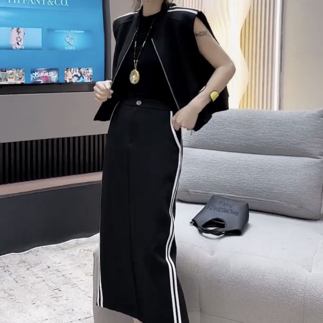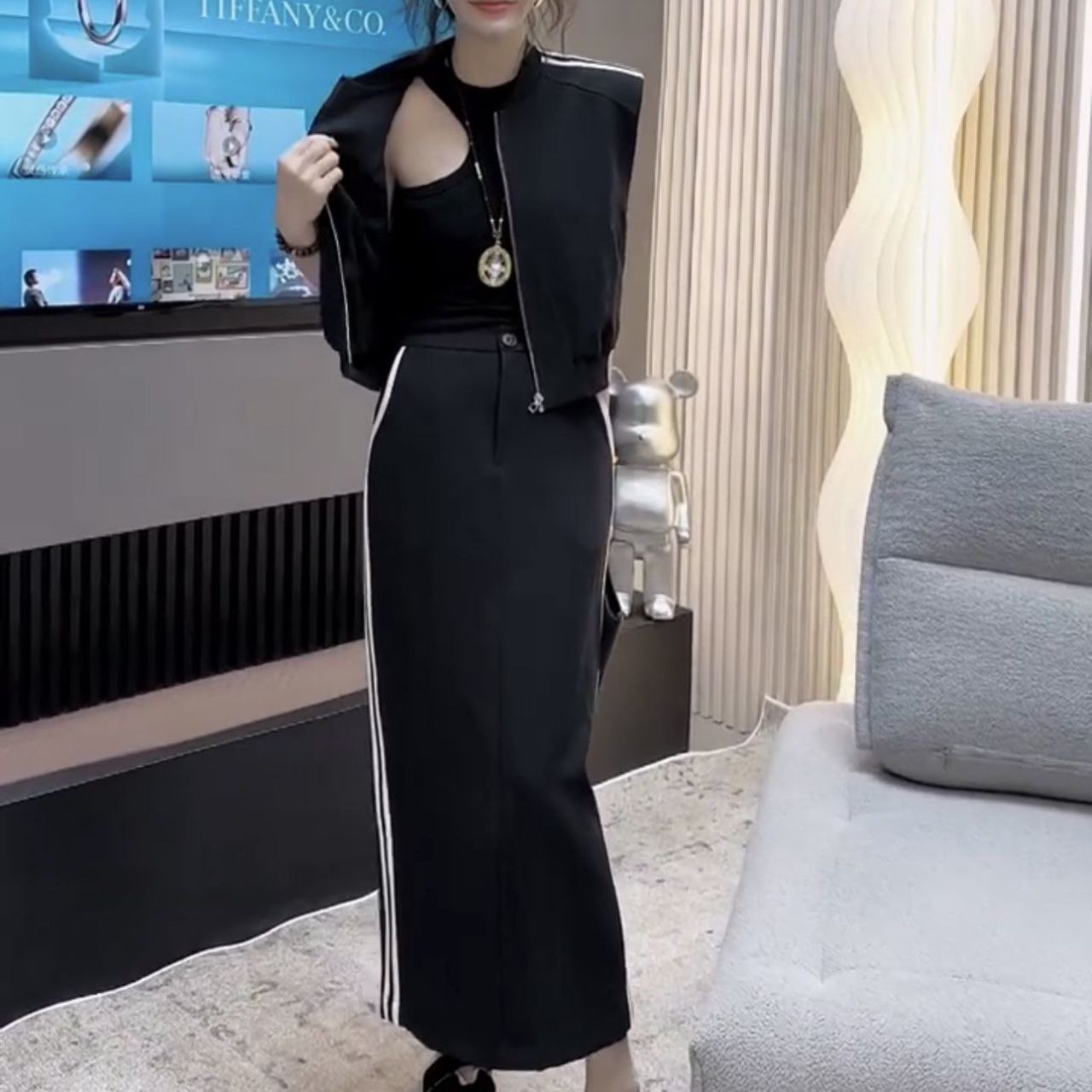 Стильный костюм состоит из укороченного жакета с асимметричной застёжкой и длинной юбки-карандаша. Модель выполнена в лаконичном чёрном и коричневом цветах с выразительными белыми лампасами по бокам юбки и по краям жакета. Сочетание спортивного акцента (лампасы) с классическим кроем создаёт современный и элегантный образ. Костюм подойдёт для создания модных повседневных или полуформальных образов — можно комбинировать с базовыми топами и аксессуарами.