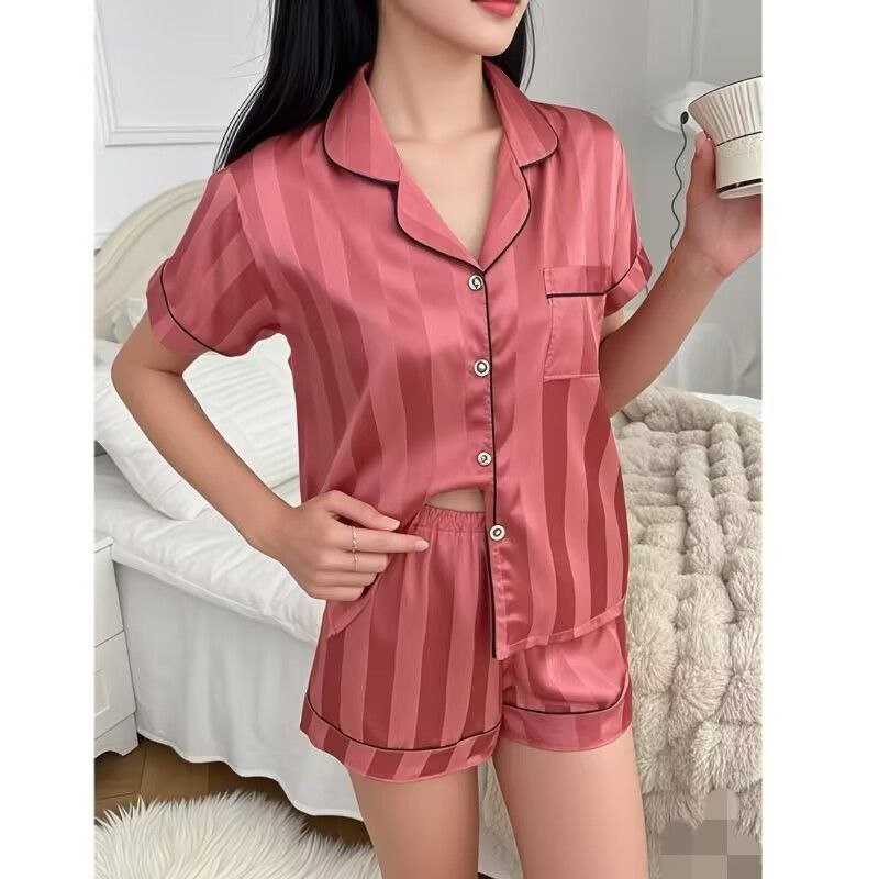 Элегантный домашний костюм-двойка, состоящий из рубашки с коротким рукавом и свободных шорт. Рубашка классического кроя застегивается на пуговицы, дополнена отложным воротником и небольшим нагрудным карманом. Шорты на мягкой эластичной резинке обеспечивают комфортную посадку. Изделия выполнены из гладкой ткани с благородным атласным блеском и принтом в виде чередующихся матовых и глянцевых полос. Контрастный кант по краям подчеркивает силуэт и придает комплекту завершенный вид. Подходит как для комфортного сна, так и в качестве стильной одежды для дома.
