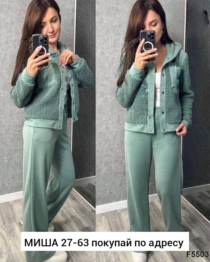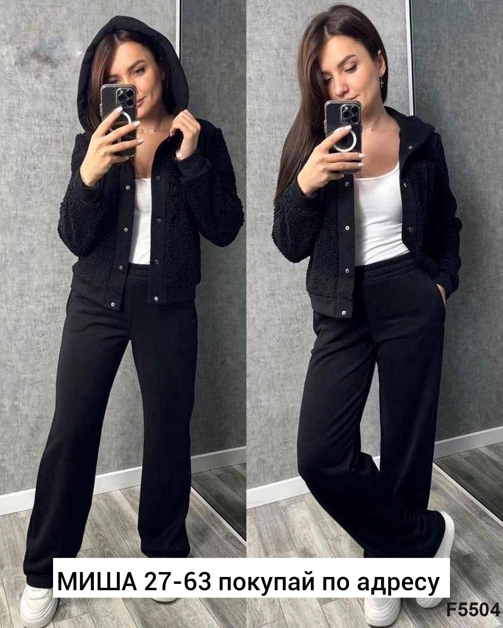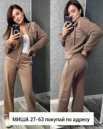 Комплект состоит из укороченной толстовки с капюшоном и длинными рукавами и свободных брюк с высокой посадкой. Брюки имеют регулируемую резинку внизу, что позволяет носить их как в стиле палаццо, так и как джоггеры. Костюм отличается комфортной посадкой, подходит для повседневной носки, домашних вечеров, прогулок в прохладную погоду. Материал — приятный на ощупь флис, практичный и тёплый.