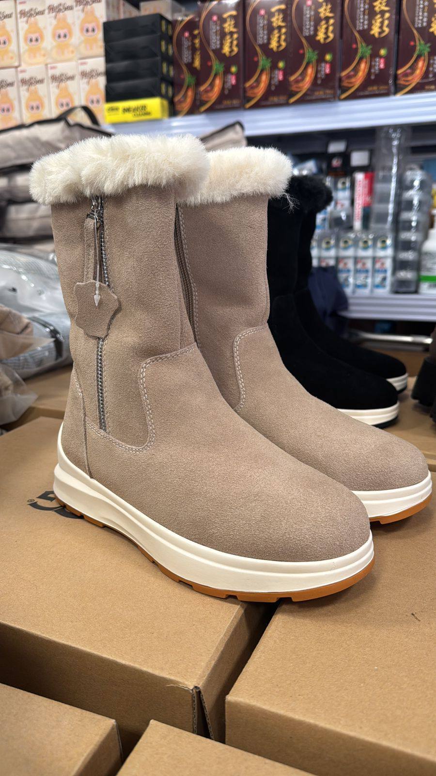 • Роскошная меховая отделка: Пушистый мех по верхнему краю голенища добавляет образу изысканности и шарма, а также обеспечивает дополнительное тепло и комфорт.