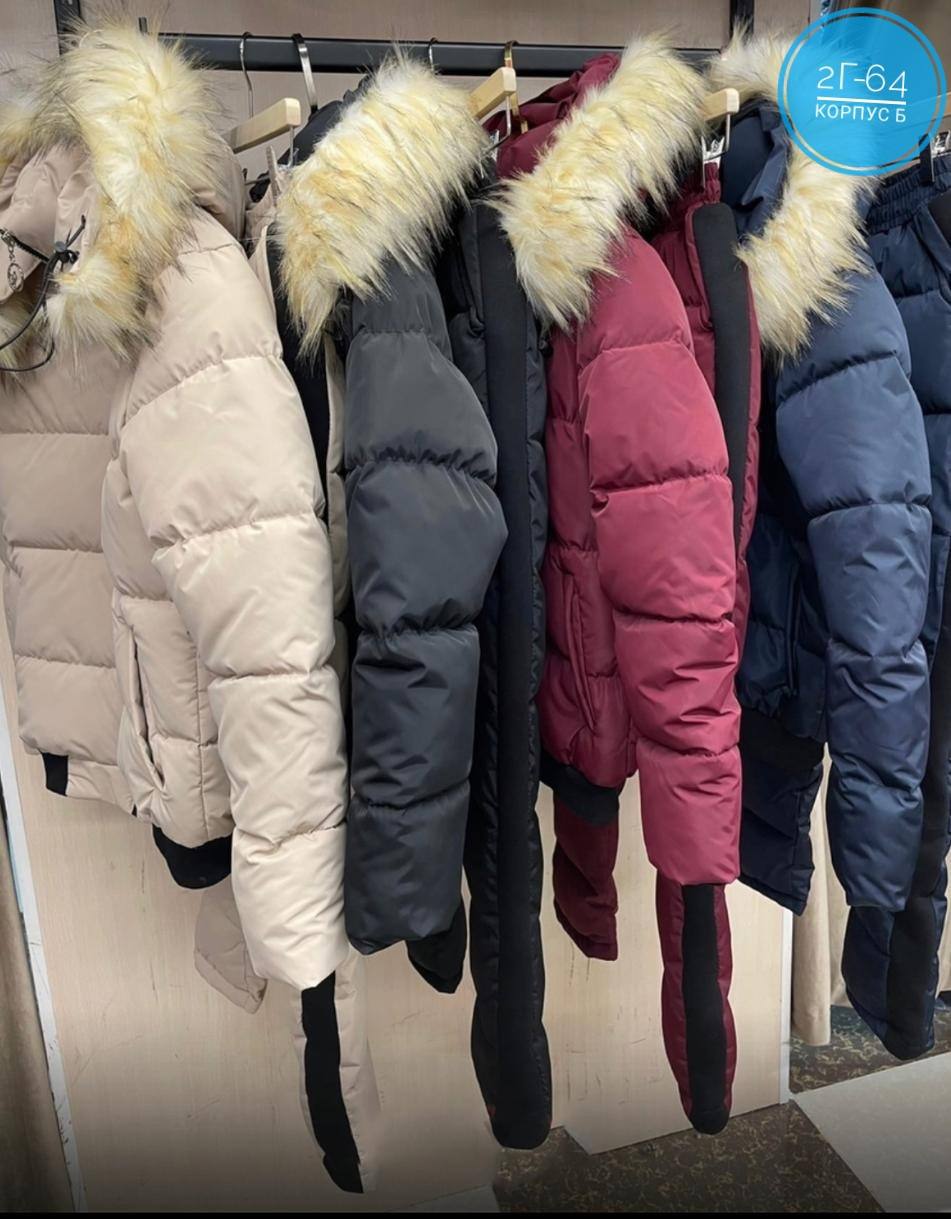 Зимний женский костюм состоит из утеплённой куртки с объёмным капюшоном, отороченным пушистым мехом, и брюк.
