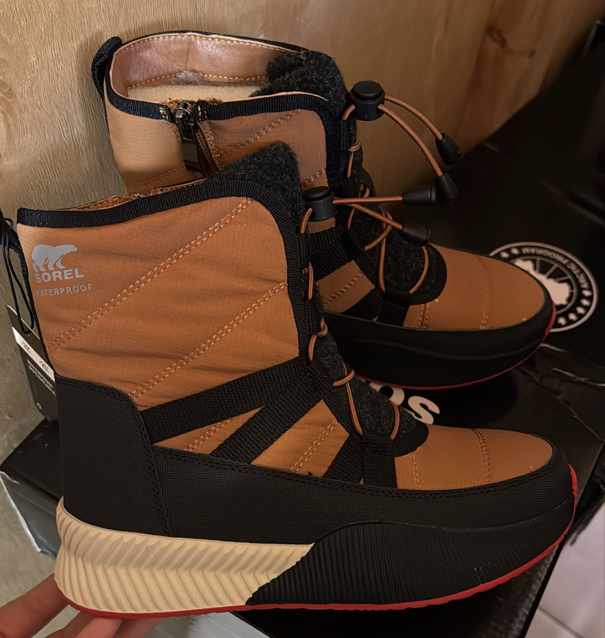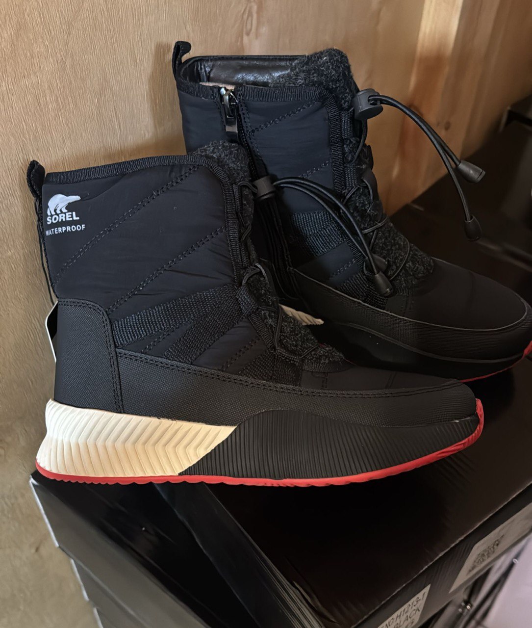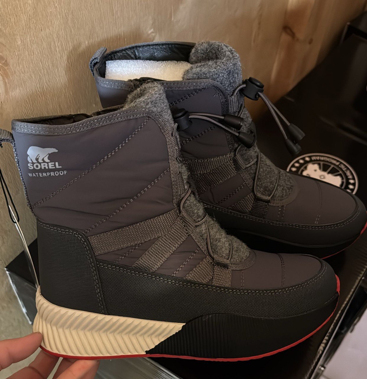 - Логотип Sorel и надпись Waterproof на боковой части ботинка подчеркивают качество и надежность модели.